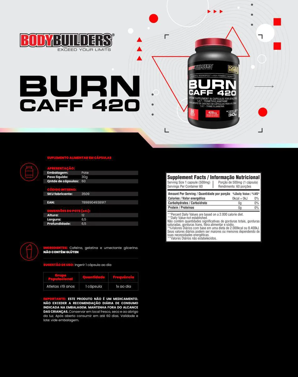 PRÉ TREINO Burn Caff 420 é indicado para as pessoas que se sentem fadigadas em treinos exaustivos e para as pessoas que visam aumentar a performance esportiva. A cafeína antes do treino pode aumentar sua resistência, o que significa mais ânimo e uma forcinha a mais para fazer aquela última série que você estava com preguiça. Além do estímulo corporal, a cafeína estimula o sistema nervoso central, deixando-o mais concentrado e aumentando o seu limite de dor.