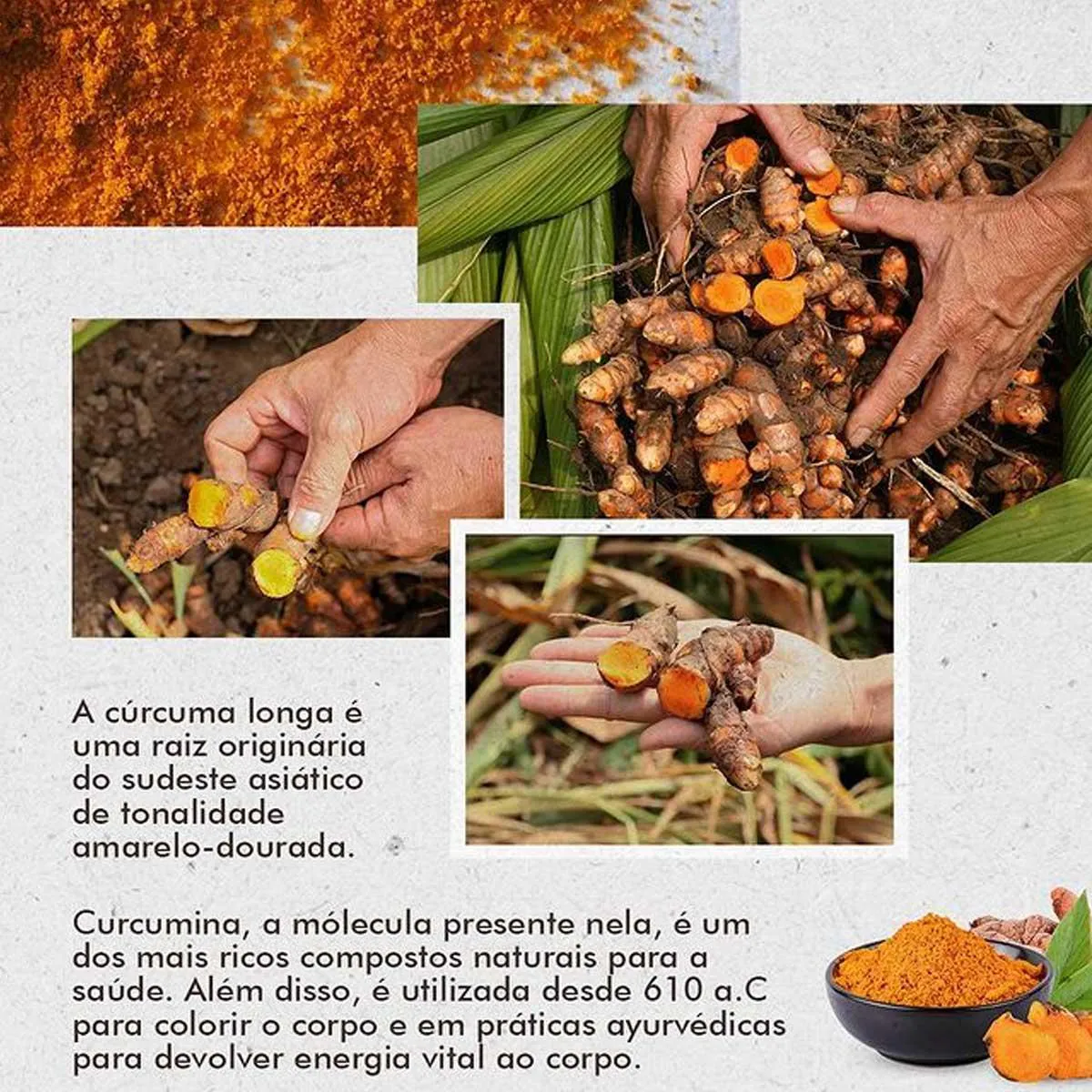 Ingredientes: Extrato de rizomas de cúrcuma longa, agente de massa celulose microcristalina e lubrificante estearato de magnésio. Cápsula: estabilizante hidroxipropilmetilcelulose e glaceantes carragena e acetato de potássio. NÃO CONTÉM GLÚTEN.