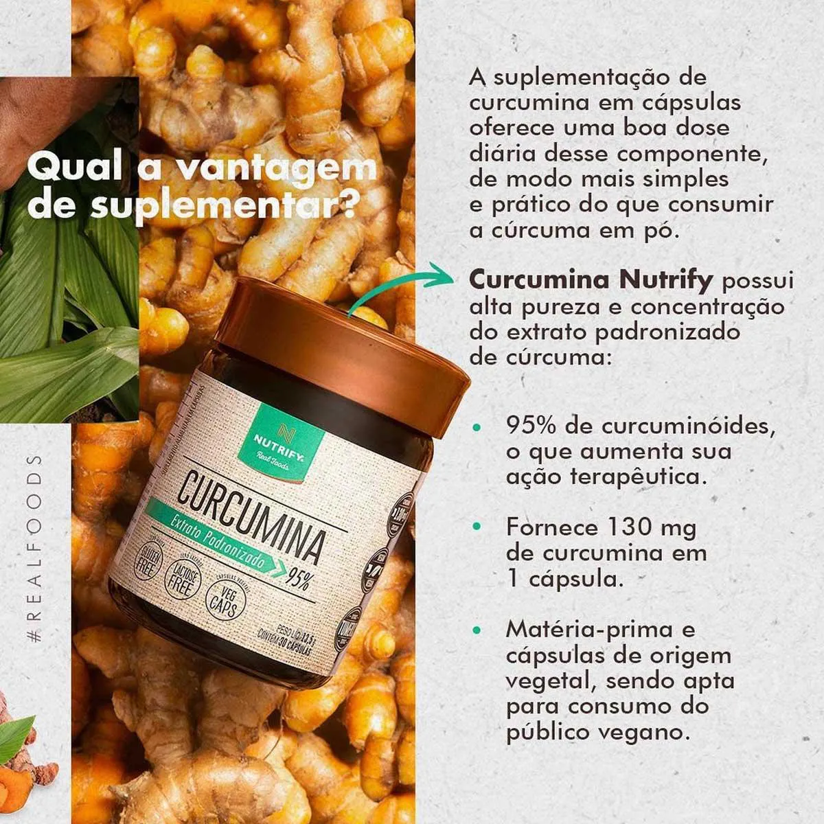 A Curcumina Nutrify 30 Cápsulas possui alta pureza e concentração do extrato padronizado de cúrcuma: 95% de curcuminóides, o que aumenta sua ação terapêutica.