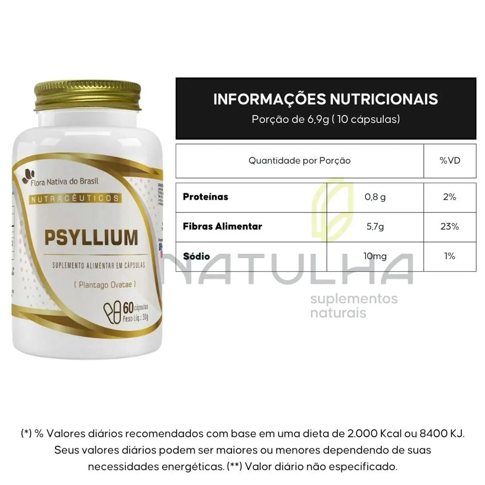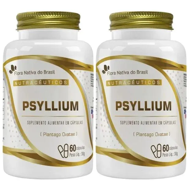 KIT com 2 unidades de Psyllium da marca Flora Nativa com 60 cápsulas cada.Uma nutrição equilibrada tem um papel muito importante na qualidade de vida. Com o ritmo acelerado de muitas pessoas, às vezes, é muito difícil prestar atenção a todos os requisitos que o corpo precisa para estar saudável e forte. Neste sentido, os suplementos cumprem a função de complementar a alimentação e ajudam a obter as vitaminas, minerais, proteínas e outros componentes indispensáveis para o correto funcionamento do organismo.COMO TOMAR Sugere-se a ingestão de 2 (duas) a 10 (dez) cápsulas deste produto ao dia, preferencialmente junto das principais refeições, ou de acordo com orientação profissional. TABELA NUTRICIONAL Porções por embalagem: 6Porção de 6,9g (10 cápsulas) Proteínas 0,8g 2% Fibra Alimentar 5,7g 23%Sódio 10mg 1% INGREDIENTES Psyllium ( Plantago ovatae) e antiumectantes talco e dióxido de Silício. Cápsula Gelificante gelatina. NÃO CONTÉM GLÚTEN.ANVISA:"Produto indicado para maiores de 19 anos""Este produto não é um medicamento.""Não exceder a recomendação diária de consumo indicada na embalagem.""Mantenha fora do alcance de crianças.""Este produto não deve ser consumido por gestantes, lactantes e crianças.""Produto dispensado de registro conforme RDC 240/2018."