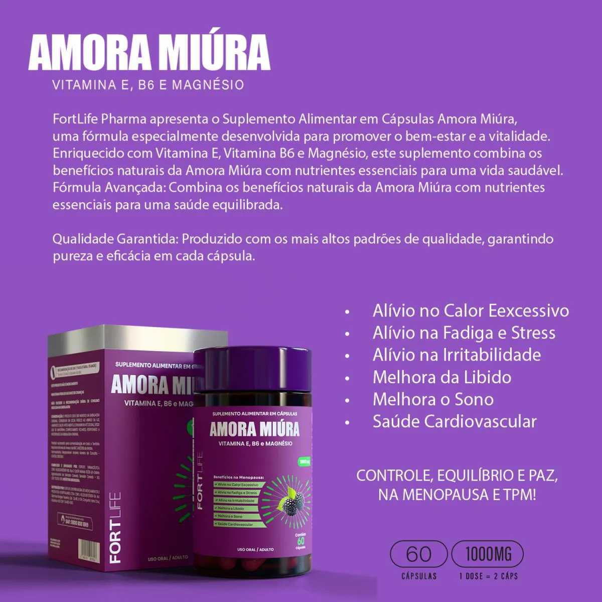 “VOCÊ NÃO É EXAGERADA. É O SEU CORPO PEDINDO SOCORRO.” ATENÇÃO, MULHER: SE VOCÊ ESTÁ NA MENOPAUSA, NÃO PRECISA AGUENTAR TUDO CALADA. Fogachos intensos? Sono desregulado? Irritabilidade que vai do nada ao caos? Libido sumindo como mágica? A culpa não é sua. E você não precisa aceitar isso como normal. Apresentamos o Amora Miúra da FortLife — um suplemento completo com ativos funcionais, desenvolvido para te devolver o controle, o equilíbrio e a paz que a menopausa tenta roubar. O QUE FAZ O AMORA MIÚRA SER DIFERENTE? Enquanto outras fórmulas apostam em promessas vazias ou hormônios sintéticos, Amora Miúra traz uma combinação inteligente, natural e segura: - Amora Miúra: A estrela da fórmula: fitonutriente com ação fitoestrogênica suave, que ajuda no equilíbrio hormonal. - vitamina e: antioxidante poderoso, combate o envelhecimento celular e reduz os efeitos do estresse oxidativo. - Vitamina B6: Essencial para o sistema nervoso, melhora o humor, reduz fadiga e auxilia no metabolismo hormonal. - Magnésio: Relaxa, melhora o sono, alivia dores musculares e regula o sistema nervoso como um maestro no controle. OS BENEFÍCIOS REAIS QUE VOCÊ VAI SENTIR Imagine passar os dias com mais leveza, foco e disposição. Com Amora Miúra, você pode: - Dizer adeus aos calores excessivos e sudorese noturna - Reduzir a fadiga crônica e o cansaço mental - Controlar a irritabilidade e oscilações de humor - Sentir sua libido reviver naturalmente - Dormir melhor, com um sono profundo e restaurador - Fortalecer seu sistema cardiovascular com suporte antioxidante - Ter mais equilíbrio físico, mental e emocional no seu dia a dia Não é milagre. É ciência + natureza em cápsulas. CHEGOU A SUA VEZ DE VIVER O SEU MELHOR CICLO Você não precisa escolher entre saúde, disposição ou bem-estar. Pode ter os três. Chega de normalizar o desconforto. Você merece mais — e pode conquistar isso a partir de hoje. 60 cápsulas | 1000mg por dose | Fórmula natural, segura e eficaz Envio rápido e seguro | Produto original FortLife COMPRAR AGORA e experimente o poder de se sentir você de novo. RECOMENDAÇÕES DE USO (Apartir de 19 ANOS): Tomar 2 (duas) cápsulas ao dia,ou conforme prescrição de um profissional habilitado.