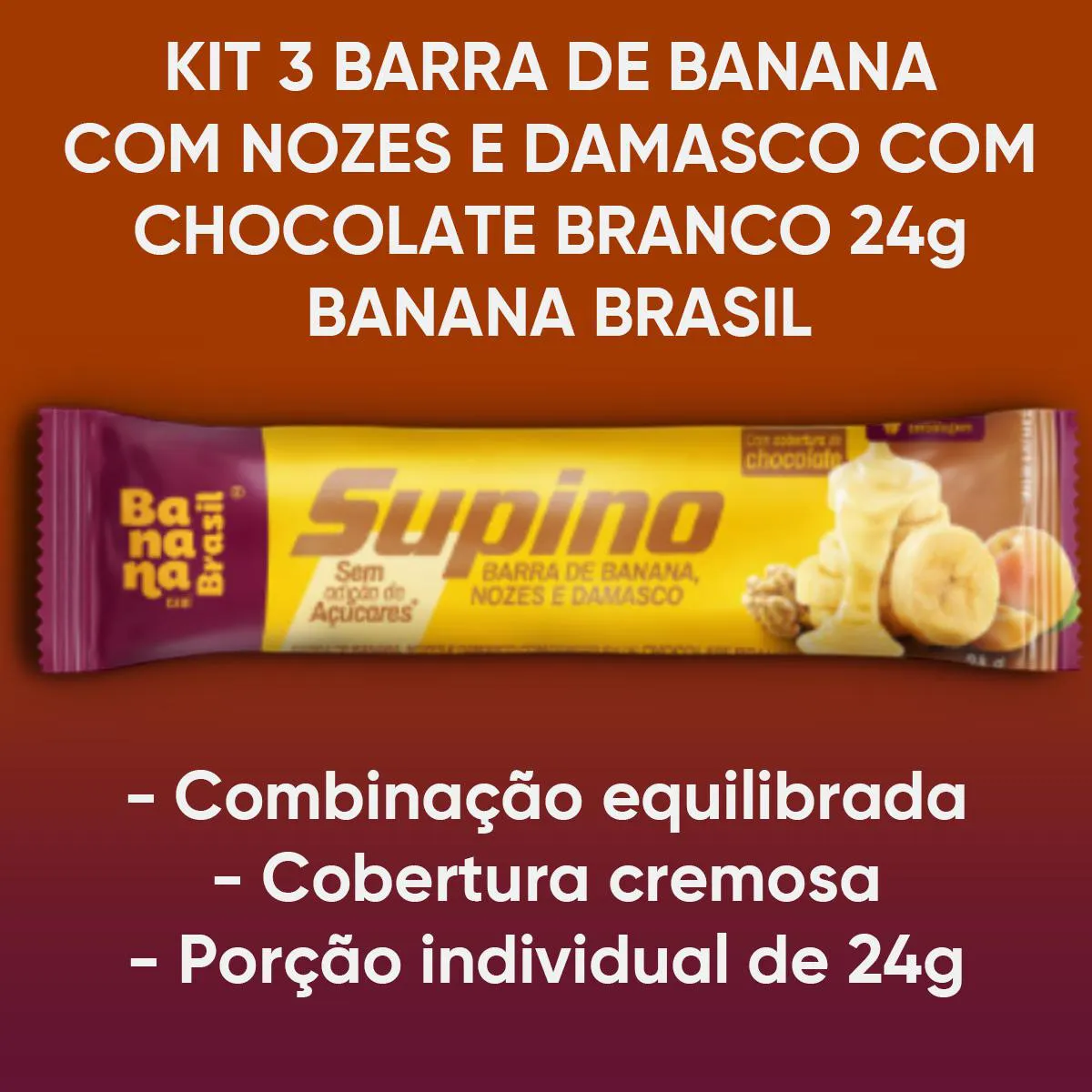 Kit 3 Barra de Banana com Nozes e Damasco com Cobertura de Chocolate Branco 24g – Banana Brasil Um mix sofisticado de frutas e nuts