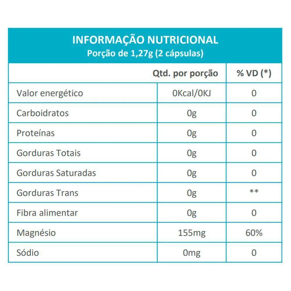 Cloreto de magnésio, carbonato de magnésio, excipiente: estearato de magnésio, silicato de magnésio, antiumectante: dióxido de silício, cápsula: hidroxipropilmetilcelulose, dióxido de titânio.