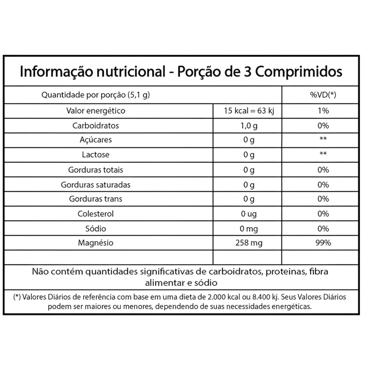 Cloreto de Magnésio, água purificada, amido de milho, antiumectantes carbonato de cálcio (INS 170i), dióxido de silício (INS 551) e estearato de magnésio (INS 470iii), estabilizantes hidroxipropilmetilcelulose (INS 464) e polivinilpirrolidona (INS 1201), agente carreador polietilenoglicol (INS 1521) e corante dióxido de titânio (INS 171). Informações adicionais: