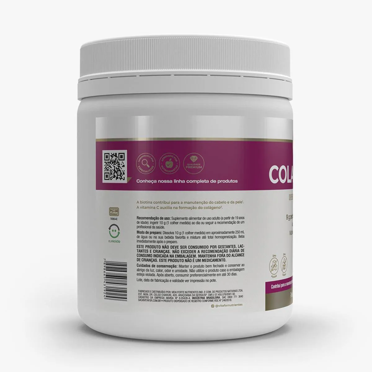 Sabor Neutro: Peptídeo de colágeno, premix de vitaminas e minerais [ácido ascórbico (vitamina c), nicotinamida (vitamina B3), acetato de Dl-alfa-tocoferol (vitamina e), D-pantotenato de cálcio (vitamina B5), sulfato de manganês (manganês), cloridrato de piridoxina (vitamina B6), sulfato cúprico (cobre), acetato de retinol (vitamina a), ácido fólico (vitamina B9), D-biotina (vitamina H), colecalciferol (vitamina d) e cianocobalamina (vitamina B12)], ácido ortosilícico estabilizado em cloreto de colina (silício), acidulante ácido cítrico, espessante goma xantana e antiumectante dióxido de silício. NÃO CONTÉM GLÚTEN.