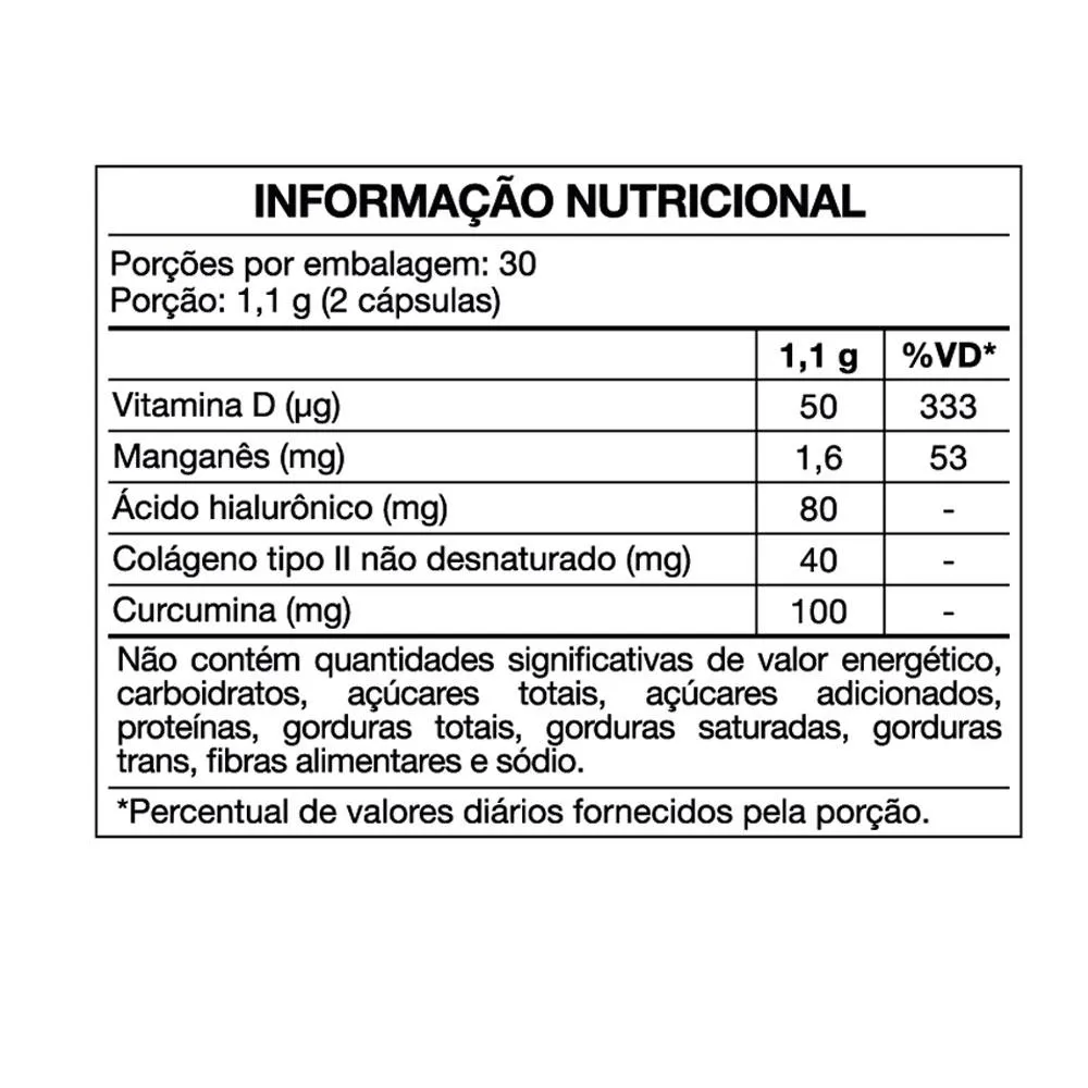 Extrato de rizomas de Curcuma longa (Curcumina), hialuronato de Sódio obtido pela fermentação de Streptococcus zoopidemicus (Ácido hialurônico), colágeno de frango com colágeno tipo II não desnaturado (Colágeno tipo II), bisglicinato de manganês (Manganês), colecalciferol (Vit. D3) e amido; Antiumectantes: silicato de magnésio hidratado (talco), estearato de magnésio e dióxido de silício; Estabilizante: polivinilpirrolidona insolúvel; Cápsula: Gelificante: gelatina.