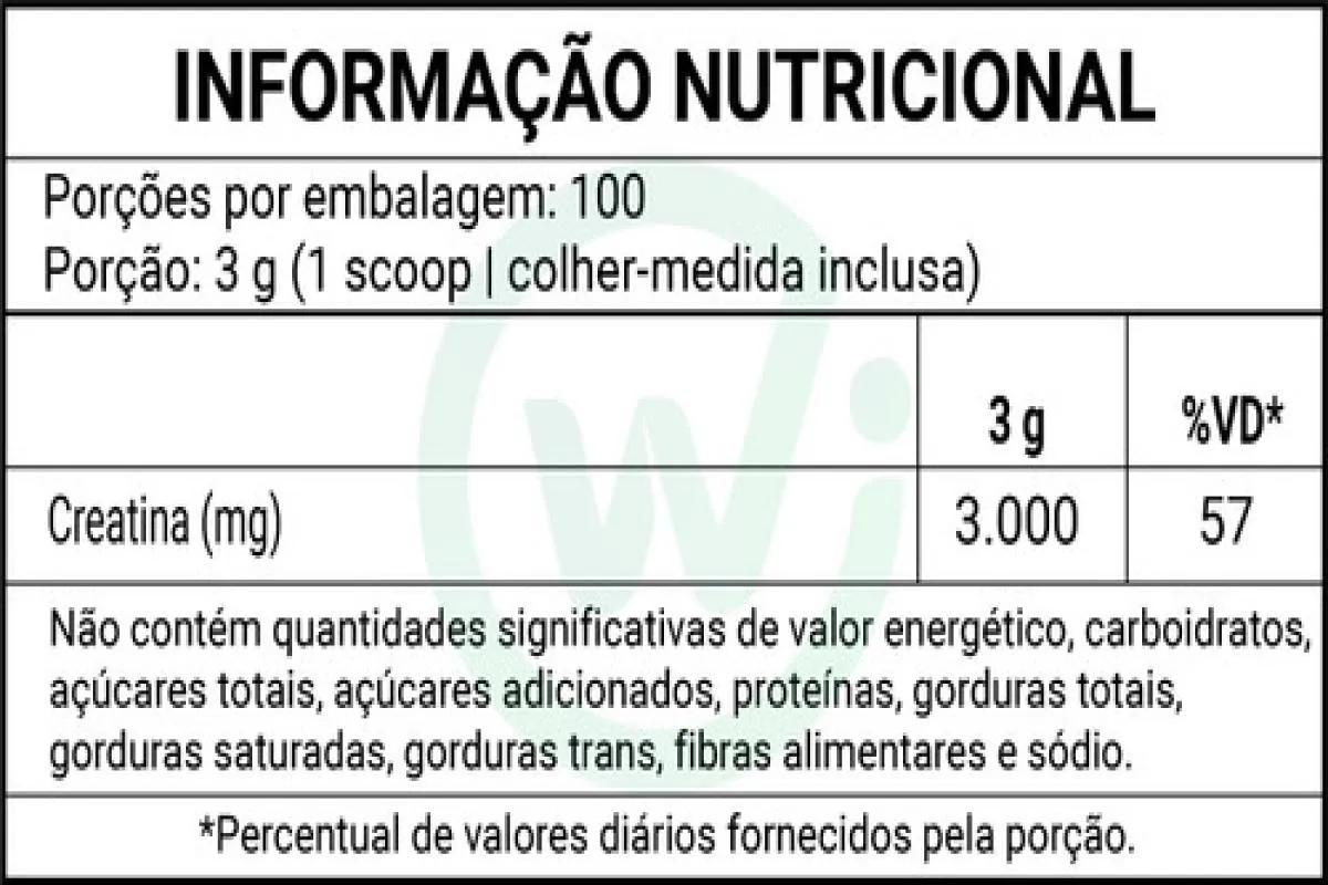 Ingrediente ativo: creatina monohidratada (100%) Alergênicos e contaminações: pode conter traços de amêndoa, amendoim, avelã, castanha-de-caju, castanhas, castanha-do-Pará, macadâmias, nozes, pecãs e pistaches (devido ao uso de equipamentos compartilhados) Glúten: não contém glúten Recomendação de Uso