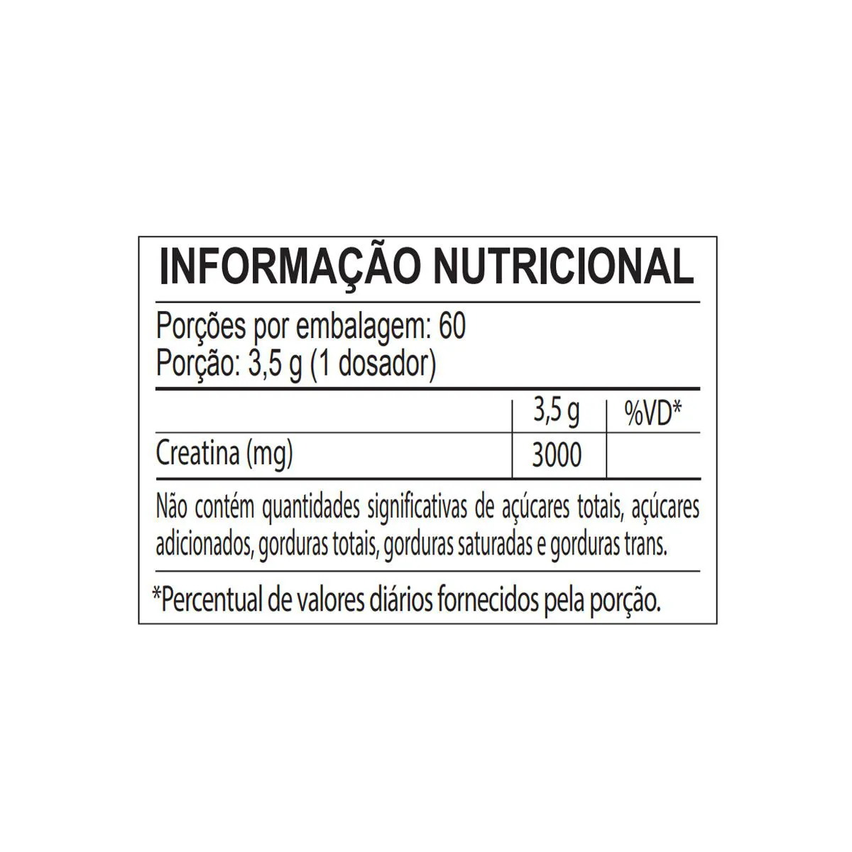 curta duração e alta intensidade APRESENTAÇÃO: Embalagem disponível: lata contendo suplemento alimentar em pó Peso Líquido: 210 g Produto classificado como: SUPLEMENTO ALIMENTAR EM PÓ. SUGESTÃO DE CONSUMO: Diluir 3,5 g (1 dosador) em 200 ml de água preferencialmente gelada. Consumir uma vez ao dia ou conforme orientação médica. CONSERVAÇÃO: Manter este produto ao abrigo de luz, calor e umidade. Após aberto, consumir em até 70 dias e manter a embalagem com a tampa fechada. INGREDIENTES: Creatina monohidratada, concentrado de rabanete e cenoura, aromatizante natural, acidulante ácido cítrico, edulcorante glicosídeos de esteviol de Stevia rebaudiana Bertoni e regulador de acidez ácido málico (D-, L-). NÃO CONTÉM GLÚTEN. ESTE PRODUTO NÃO É UM MEDICAMENTO. NÃO EXCEDER A RECOMENDAÇÃO DIÁRIA DE CONSUMO INDICADA NA EMBALAGEM. MANTENHA FORA DO ALCANCE DE CRIANÇAS. ESTE PRODUTO NÃO DEVE SER CONSUMIDO POR GESTANTES, LACTANTES E CRIANÇAS. ESTE PRODUTO É RECOMENDADO PARA ADULTOS A PARTIR DE 19 ANOS. Registro RDC nº 240/2018 ANVISA