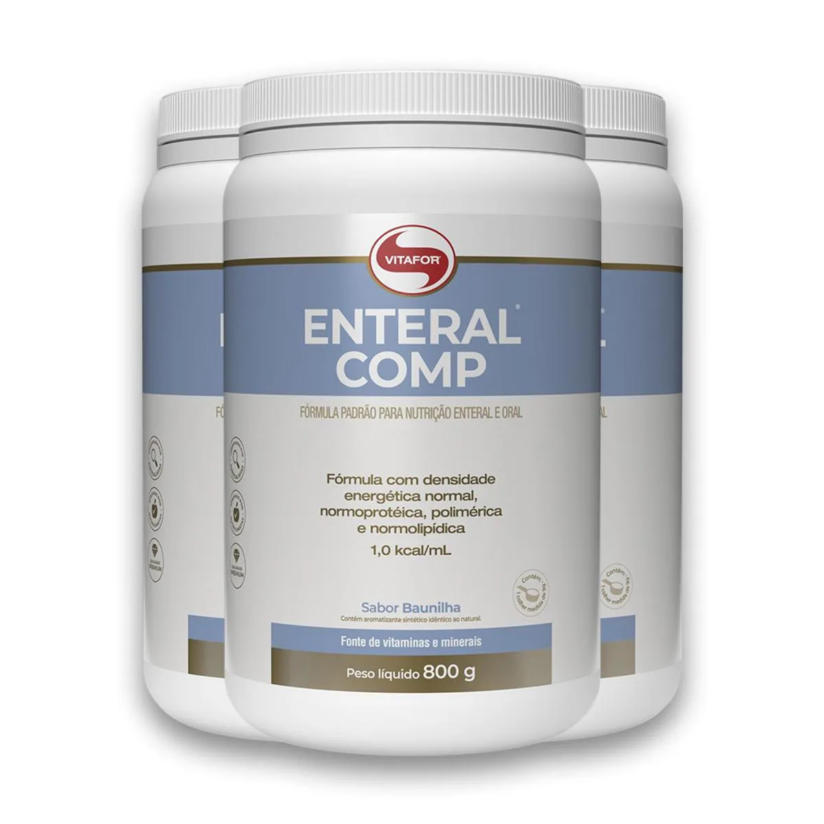 Kit 3 Enteral Completo Vitafor 800g Baunilha ENTERAL COMP é um alimento nutricionalmente completo, elaborado estrategicamente para atender necessidades nutricionais especializadas. Diferenciais: - Cada preparação fornece 1,0 kcal/ml.