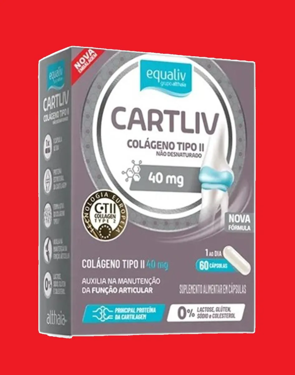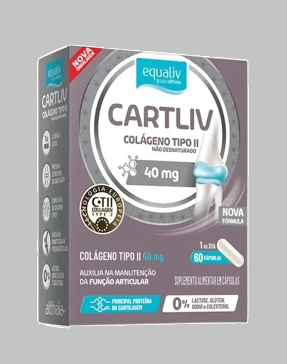 Equaliv CartLiv é um suplemento a base de colágeno tipo II não hidrolisado, que contribui mantendo e restaurando a função das articulações. O consumo adequado de Equaliv CartLiv contribui na manutenção do colágeno, mantendo e restaurando a função das articulações desgastadas por artrite reumatoide e osteodistrofia; atividades físicas repetitivas e prolongadas; sobrecarga nas articulações por excesso de peso, entre outros.
