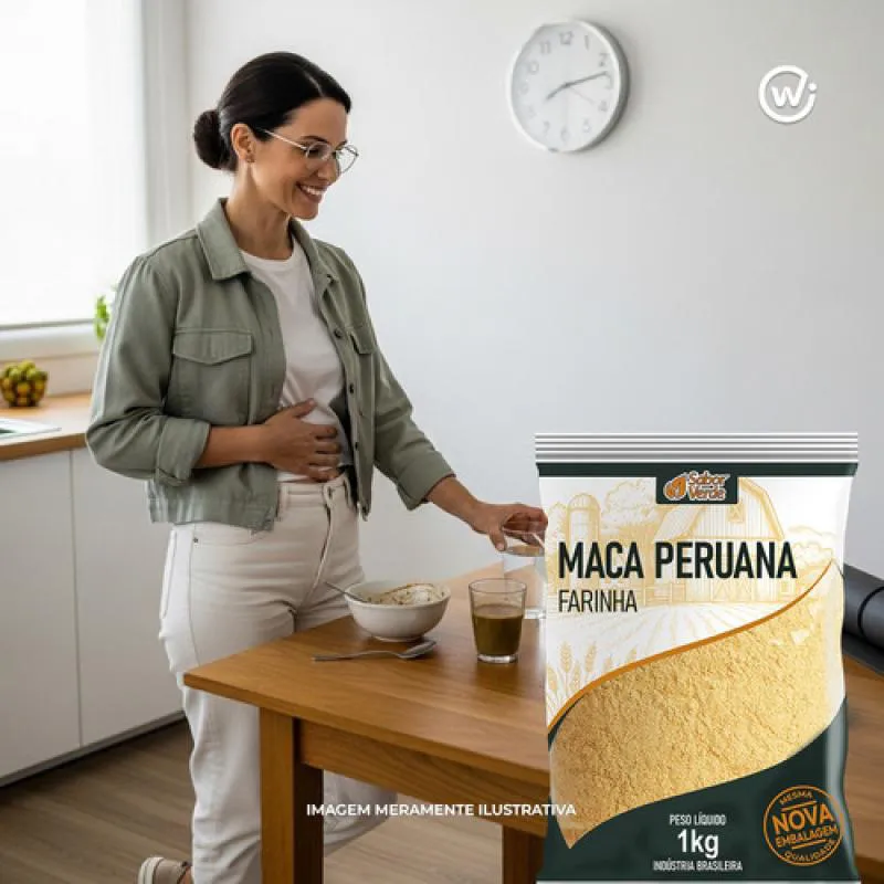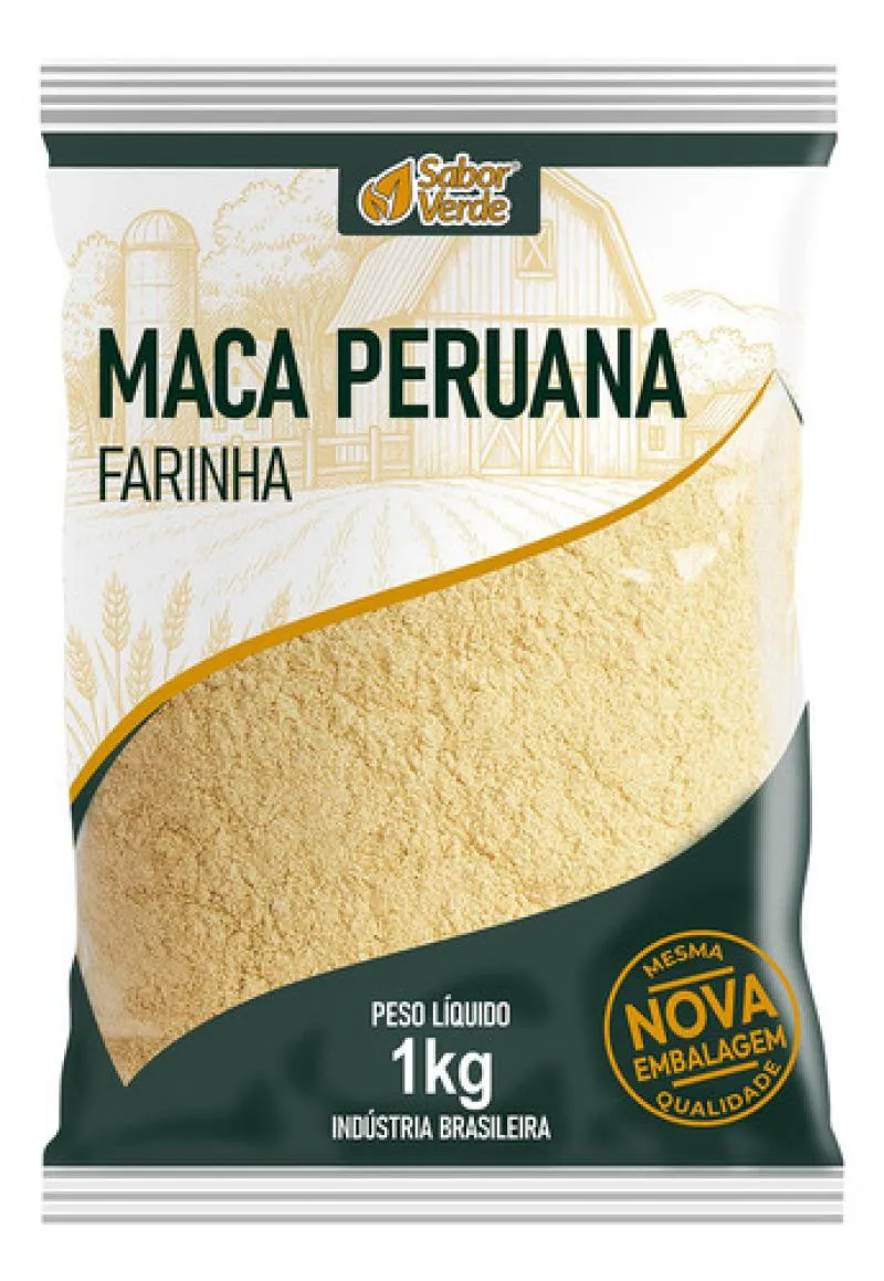 A Farinha de Maca Peruana da linha Sabor Verde é apresentada em embalagem de 1 kg, produzida a partir da raiz de Lepidium meyenii, cuidadosamente moída para preservar seus nutrientes essenciais.