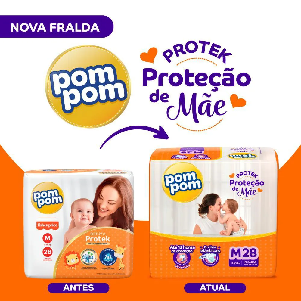 Pom Pom Protek Proteção de Mãe é a proteção que cuida do seu bebê por até 12 horas, garantindo dias e noites tranquilas, com orelhas elásticas que garantem mais conforto e um ajuste perfeito na cinturinha do bebê, e canal superabsorvente que distribui o xixi mais rápido, evitando que a fralda pese e caia entre as perninhas do bebê.