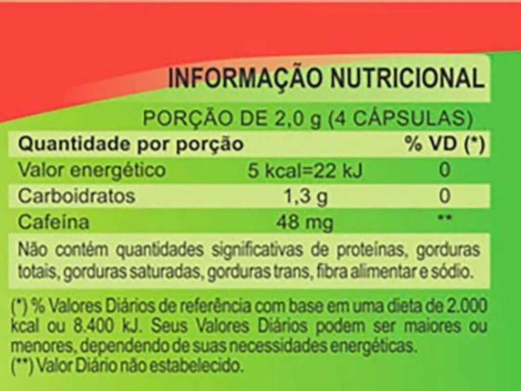 - Cafeína Natural. Ingredientes: Guaraná em pó. Cápsula: gelatina vegetal e água. NÃO CONTÉM GLÚTEN.