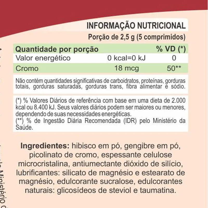 - Vegano. Modo de Uso: Sugere-se a ingestão de 5 comprimidos ao dia, nos intervalos das refeições. Ingerir com líquido. Ingredientes: Hibisco em pó, gengibre em pó, picolinato de cromo, espessante celulose microcristalina, antiumectante dióxido de silício, lubrificante silicato de magnésio, estearato de magnésio, edulcorante sucralose, edulcorantes naturais: glicosídeos de steviol e taumatina. NÃO CONTÉM GLÚTEN. Avisos: - Este produto não é um medicamento.