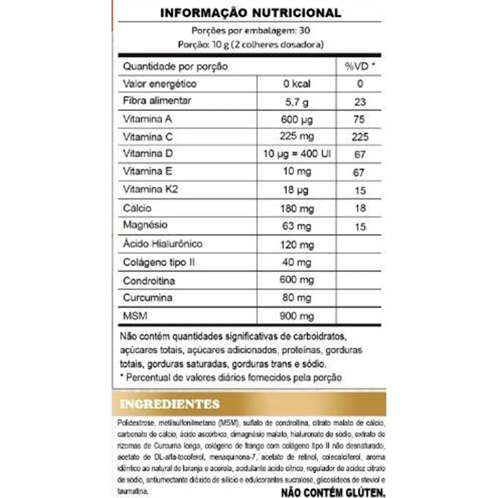 Polidextrose, metilsulfonilmetano (MSM), sulfato de condroitina, citrato malato de cálcio, carbonato de cálcio, ácido ascórbico,dimagnésio malato, hialuronato de sódio, extrato de rizomas de Curcuma longa, colágeno de frango com colágeno tipo II não desnaturado, acetato de DL-alfa-tocoferol, menaquinona-7, acetato de retinol, colecalciferol, aroma idêntico ao natural de laranja e acerola, acidulante ácido cítrico, regulador de acidez citrato de sódio, antiumectante dióxido de silício e edulcorantes sucralose, glicosídeos de steviol e taumatina.