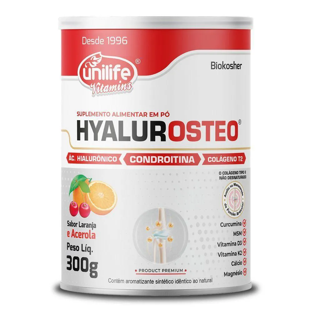 O Hyalurosteo é um produto premium da Unilife. Um combinado de Ácido Hialurônico, Condroitina e colágeno Tipo II Não Desnaturado que auxiliam na manutenção da função articular. Conta também em sua composição com: Metilsulfonilmetano (MSM), Curcumina, Vitamina D3, Vitamina K2, Magnésio e Cálcio. Ação antioxidante e reforço nas defesas naturais do organismo. Sabor Laranja e Acerola.Benefícios