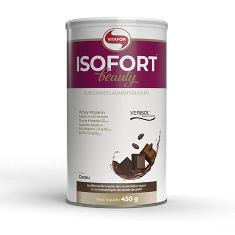 Sobre o produto ISOFORT® BEAUTY é um suplemento alimentar rico em proteínas: Proteína de soro do leite isolada (Whey Protein Isolate - WPI) e proteína de soro do leite hidrolisada (Whey Protein Hidrolyzed - WPH), nutriente esse que auxilia na formação dos músculos e ossos1, além de conter Peptídeos Bioativos de colágeno - Verisol™, que auxiliam na manutenção da saúde da pele2, Vitaminas A, C, Biotina e Zinco.
