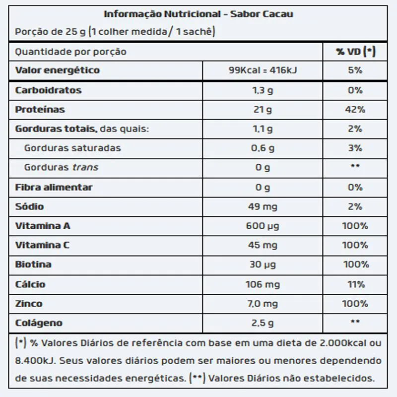 Modo de usar Misture uma porção de 25 g (1 colher medida/ 1 sachê) com 200ml de água ou bebida de sua preferência. Não exceder o consumo diário indicado. Ingredientes Proteína de soro do leite isolada (Whey Protein Isolate - WPI), proteína de soro do leite hidrolisada (Whey Protein Hidrolyzed - WPH), peptídeos bioativos de colágeno hidrolisado com peso molecular médio de 2kDa (Verisol™), cacau em pó, ácido ascórbico (vitamina C), bisglicinato de zinco (zinco), acetato de retinol (vitamina A), D-biotina (biotina), espessante goma xantana e edulcorantes glicosídeo de esteviol (estévia) e taumatina. ALÉRGICOS: CONTÉM DERIVADOS DE LEITE E LECITINA DE soja. CONTÉM LACTOSE. NÃO CONTÉM GLÚTEN.