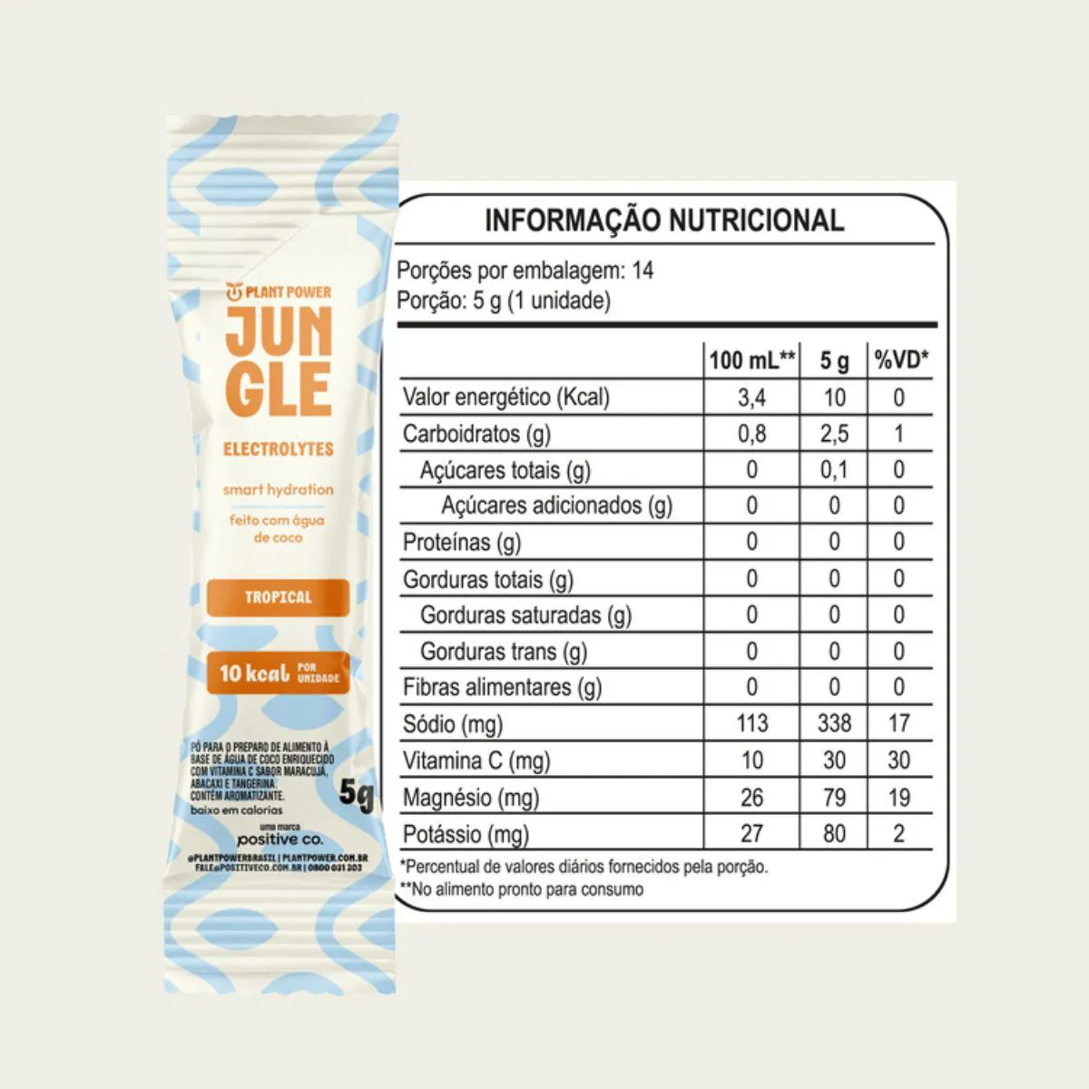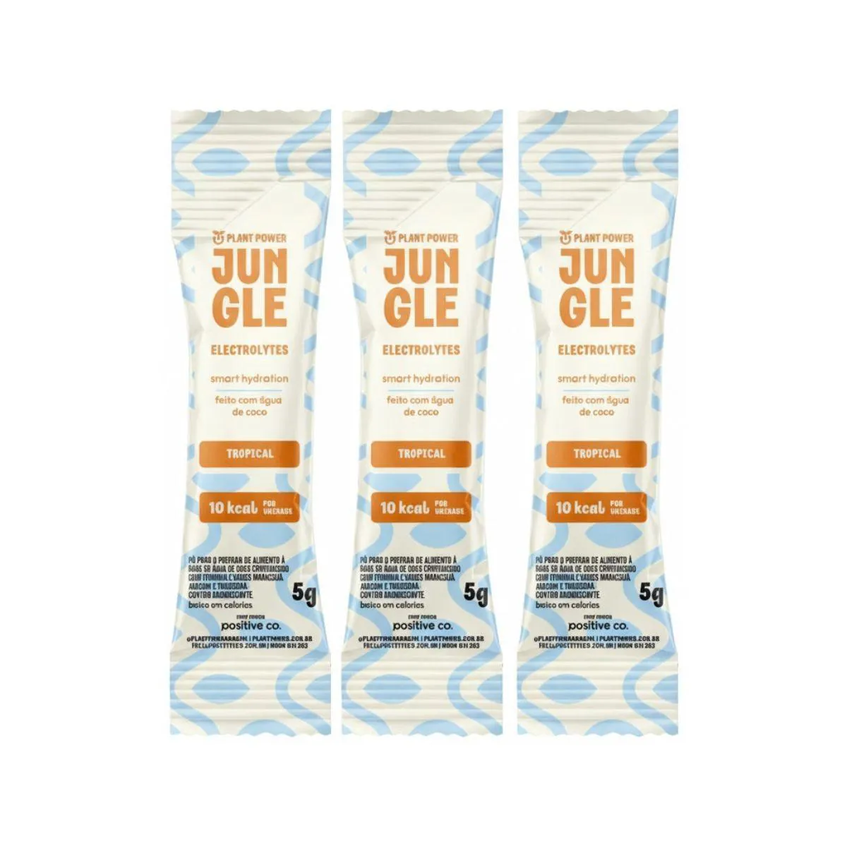 KIT 3 JUNGLE ELECTROLYTES TROPICAL 5G PLANT POWER O Jungle Electrolytes Tropical 5g Plant Power é a escolha ideal para quem busca uma hidratação funcional, leve e cheia de sabor. Desenvolvido para acompanhar sua rotina ativa, ele combina os sabores vibrantes de maracujá, abacaxi e tangerina, proporcionando uma experiência refrescante e equilibrada a cada gole. Faz parte da linha Low Carb da Jungle Electrolytes e foi formulado com uma combinação precisa de vitaminas e minerais essenciais para repor eletrólitos e manter o corpo em equilíbrio. Cada sachê de 5g, diluído em 300ml de água, fornece 30mg de vitamina c, 79mg de magnésio, 80mg de potássio e 338mg de sódio, com apenas 10 calorias por porção. Sua fórmula limpa e natural é totalmente livre de açúcar, conservantes, corantes e aditivos artificiais, garantindo hidratação de forma leve, saudável e deliciosa. Diferenciais do Produto Sabor tropical de maracujá, abacaxi e tangerina 30mg de vitamina C por porção Reposição de magnésio, potássio e sódio Apenas 10 calorias por sachê Zero açúcar, sem conservantes ou corantes artificiais Fórmula limpa e de fácil dissolução Modo de preparo Diluir 1 sachê de 5g em 300ml de água e misturar até completa dissolução. Consumir logo após o preparo. Ideal para Repor eletrólitos em treinos, calor intenso ou rotina agitada Garantir hidratação funcional e saborosa Manter o equilíbrio mineral do corpo de forma natural