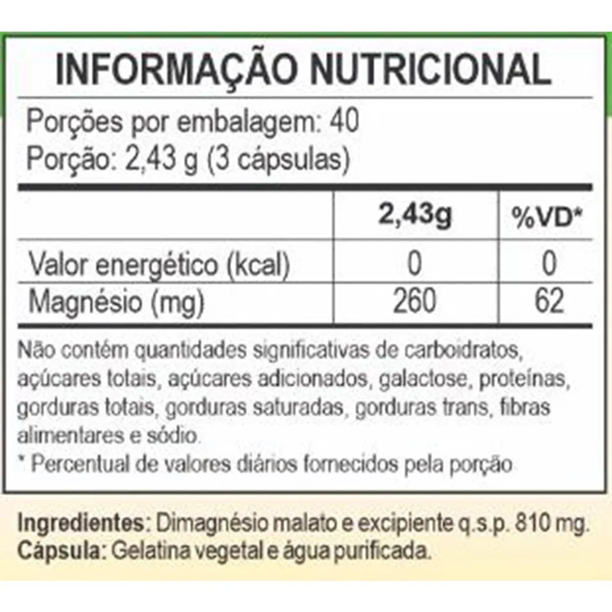 Magnésio dimalato e excipiente q.s.p. 810 mg. Cápsula: gelatina vegetal e água purificada.