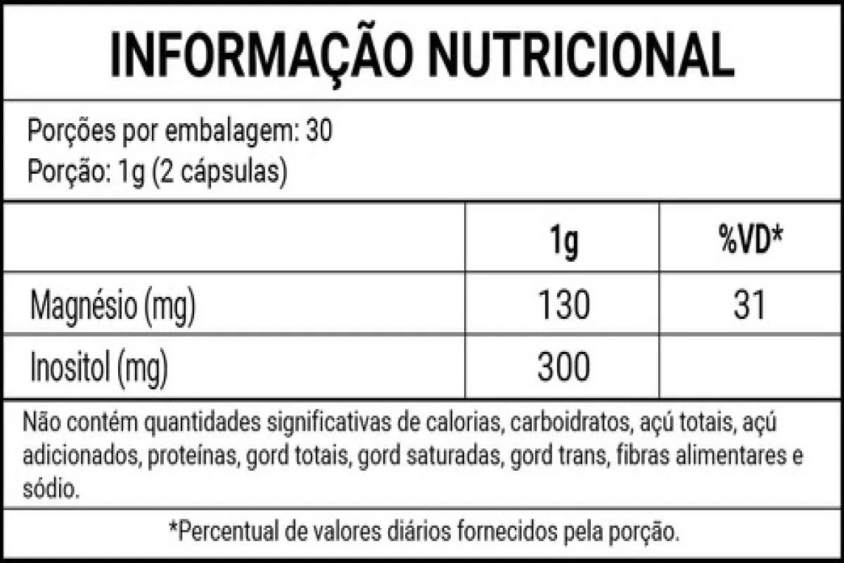 Combinação de magnésio e mio-inositol, dois nutrientes amplamente utilizados para suporte ao sistema nervoso. Contribui para o equilíbrio metabólico e celular. Auxilia no bom funcionamento muscular e neurológico. Cápsulas práticas para consumo diário. Produto sem glúten.Ingredientes e Composição