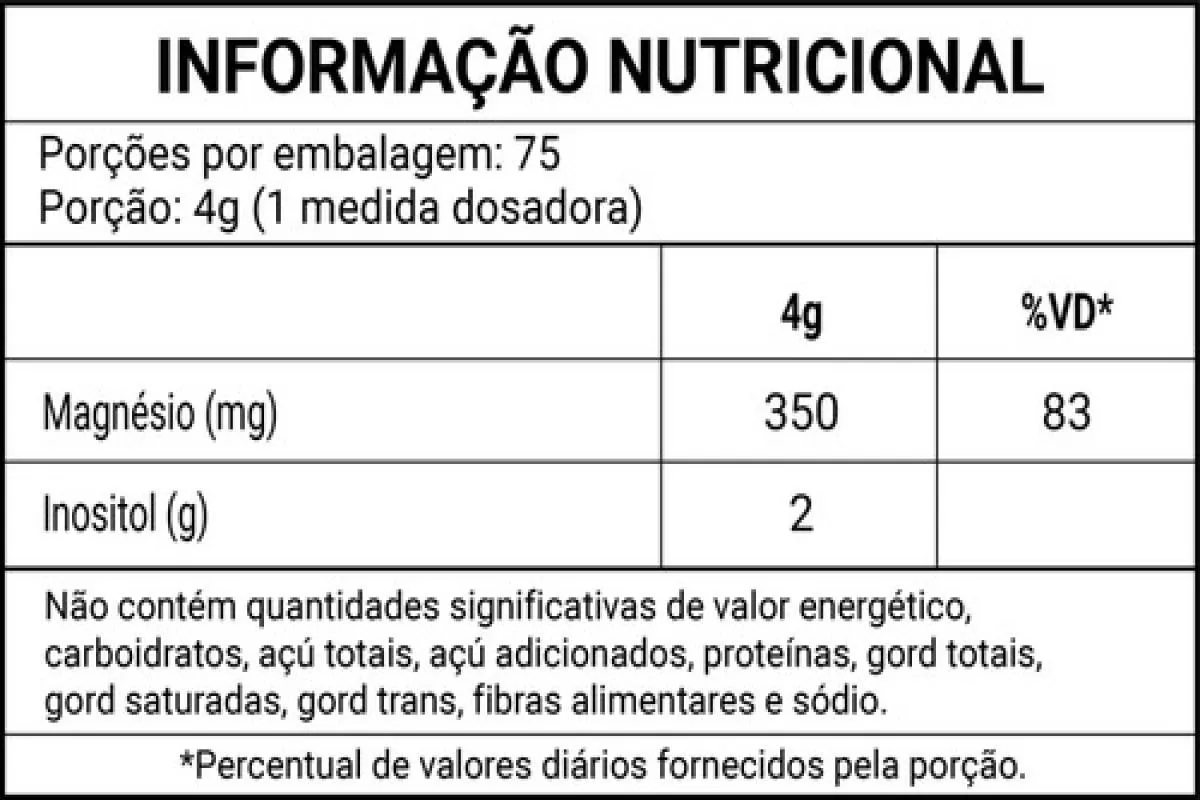 Ingredientes principais e excipientes incluem: Inositol Bisglicinato de magnésio Polpa de limão desidratada Acidulante (ácido cítrico) Aromatizante natural Edulcorante (glicosídeos de esteviol / stevia) Corante natural de clorofila Sem glúten, sem lactose Sem corantes ou adoçantes artificiais adicionados Informações Nutricionais / Perfil por Porção (4g — 1 medida dosadora) Magnésio: 350mg (≈ 83% do Valor Diário) Inositol: 2.000 mg (2g) Porções por embalagem: cerca de 75 (*) Valores Diários de referência para uma dieta de 2.000kcal.(**) Valores diários não estabelecidos para o inositol.