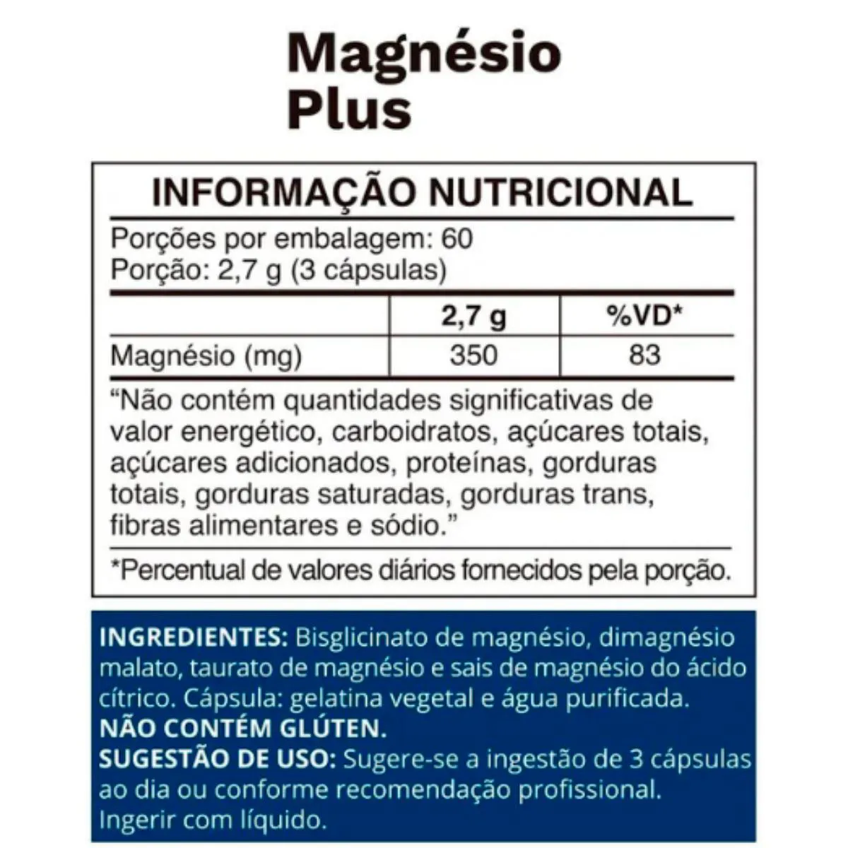 Bisglicinato de magnésio, dimagnésio malato, taurato de magnésio, citrato de magnésio. Cápsula: gelatina vegetal e água purificada. Não contém glúten. Posologia: