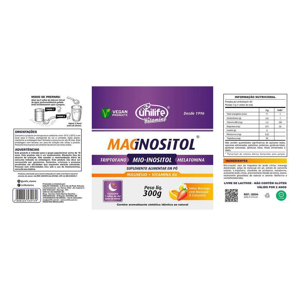 Kit 3 Magnositol Morango com Maracujá e Camomila Unilife 300gPossui uma composição única, exclusiva, pois além do magnésio e Inositol, contém ainda, maracujá, camomila, capim-limão, triptofano, vitamina B6 e melatonina.O Magnésio auxilia no funcionamento muscular e neuromuscular.O Inositol auxilia na fabricação de células saudáveis.Maracujá, camomila, capim-limão colaboram na promoção da calma e diminuição do estresse.Triptofano e vitamina B6 auxiliam na produção da serotonina e a melatonina, que é o hormônio do sono, auxilia na qualidade do sono.Modo de uso: Diluir 5g (1 colher de chá) em 150ml de água, preferencialmente gelada. Beba imediatamente após o preparo. Ingerir 2 horas antes de dormir.Ingredientes: Mio-inositol, sais de magnésio ácido cítrico, morango desidratado, polpa de maracujá em pó, extrato de camomila solúvel, L-triptofano, cloridrato de piridoxina, melatonina, acidulante ácido cítrico, antiumectante dióxido de silício, aroma, edulcorante glicosídeos de esteviol e corante riboflavina e vermelho beterraba.LIVRE DE LACTOSE.NÃO CONTÉM GLÚTEN.Produto autorizado para comercialização em todo o território nacional através do anexo I da RDC 240/2018 da ANVISA. AFE do MS 6.02234-1.