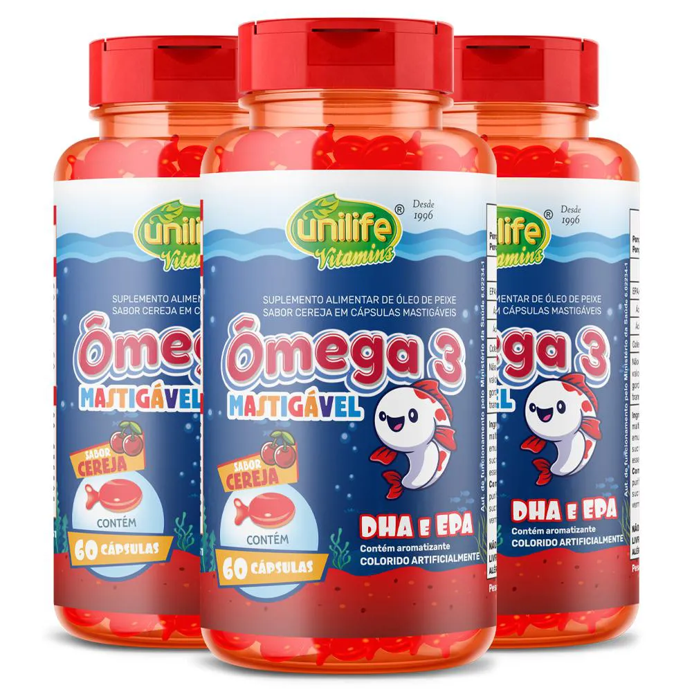 Kit 3 Ômega 3 Kids Mastigável Unilife Cereja 60 Cápsulas