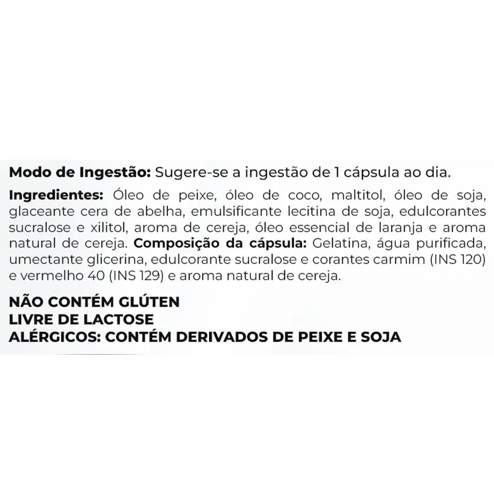 Óleo de peixe, óleo de coco, maltitol, óleo de soja, glaceante cera de abelha, emulsificante lecitina de soja, edulcorantes sucralose e xilitol, aroma de cereja, óleo essencial de laranja e aroma natural de ceraja.