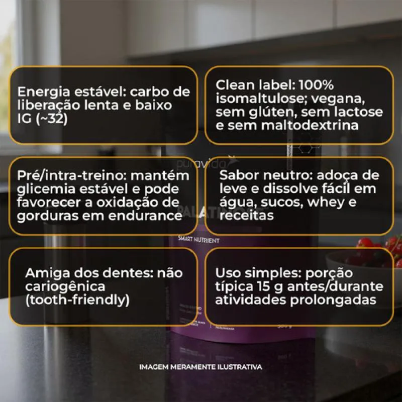 Ingrediente ativo: isomaltulose (palatinose). Sem glúten.