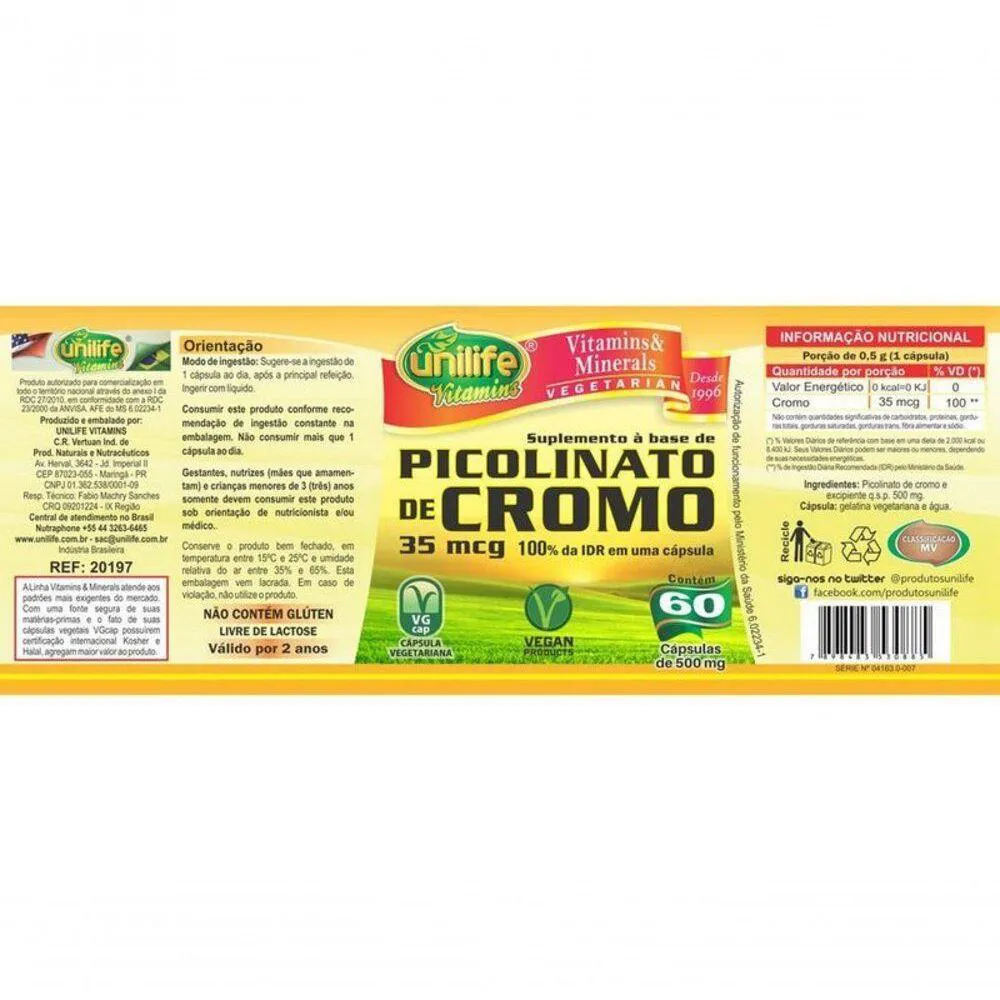 _x000D_A Unilife proporciona 2 variações de Picolinato de Cromo, uma delas na versão de 60 cápsulas com diferencial de cápsulas veganas, e outra na versão de 120 cápsulas com propriedades bovinas em sua composição, ambas possuem a mesma orientação, que é utilizar 1 cápsula ao dia após a principal refeição, e consumir o produto juntamente com líquidos, o aumento dessa quantidade deve ser feito somente com acompanhamento nutricional, podendo trazer irregularidades a seu organismo._x000D__x000D_Picolinato de Cromo da Unilife possui algum efeito colateral?