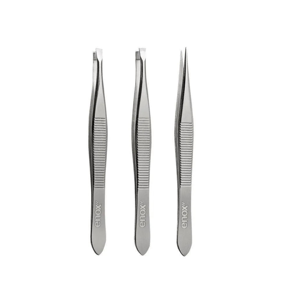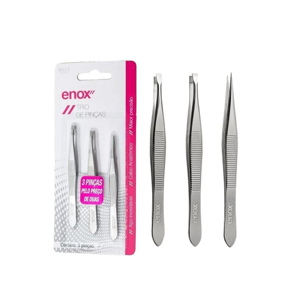 Kit 3 Pinças para Sobrancelha Ponta Reta Diagonal e Fina EnoxKit com três pinças essenciais: ponta reta, dupla e fina. Enox Trio de Pinças é ideal para remoção de todos os tipos de pelo com praticidade.Kit Enox Trio de Pinças possui modelos de cabo anatômico e que oferecem maior precisão e conforto para permitir uma retirada ideal dos fios. De aço inox, possui alta durabilidade e pode ser higienizada com facilidade.Contém:Enox Ponta Reta - Pinça: para retirar todos os tipos de pelos.Enox Ponta Fina - Pinça: para a retirada dos pelos curtos ou encravados.Enox Ponta Dupla - Pinça: para retirar pelos finos e delicados um a um pela raizConselho de AplicaçãoSelecione o pelo a ser removido e segure-o com firmeza pela