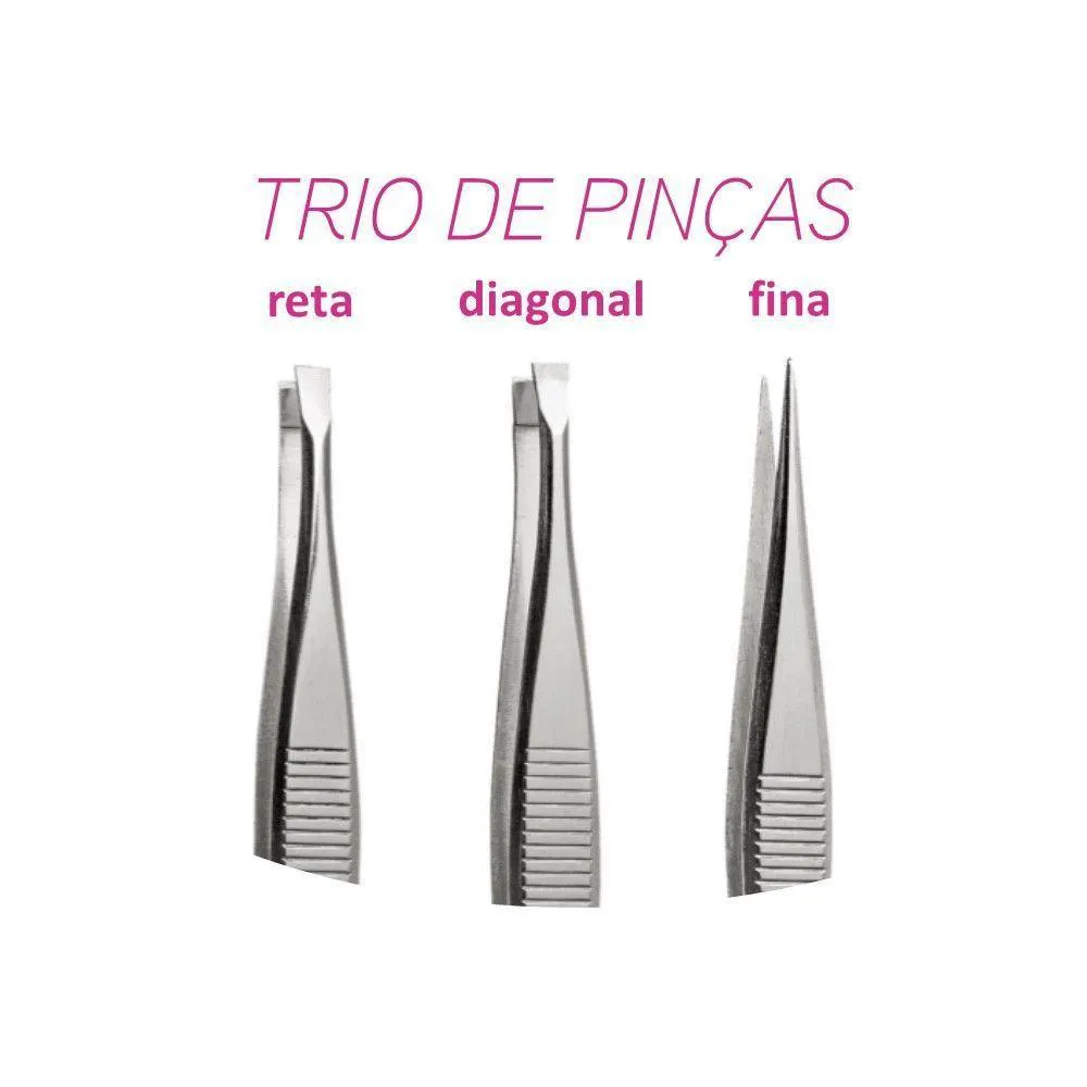 Kit 3 pinças Para Sobrancelha Ponta Reta Diagonal E Fina Enox