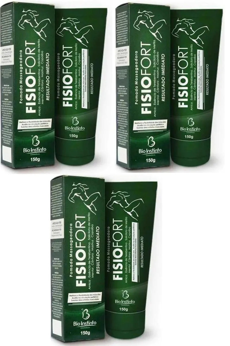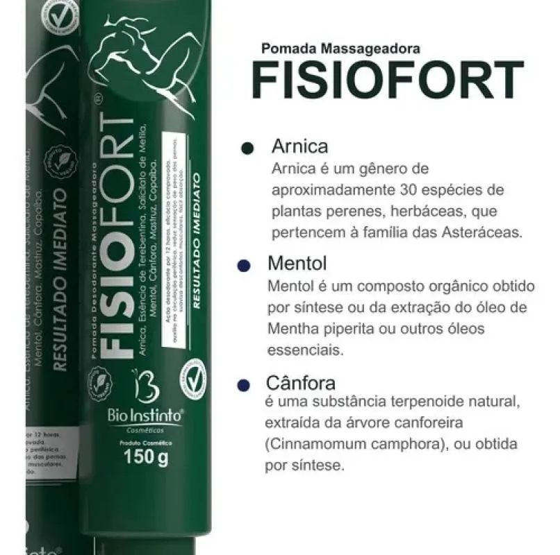 Pomada Massageadora Fisiofort Tradicional C/ Arnica 150g A Pomada Desodorante Massageadora Fisiofort Bio Instinto é um produto cosmético elaborado com extratos vegetais típicos da flora brasileira. Tem eficácia desodorante por 12 horas, mantendo a pele livre de microrganismos causadores de maus odores durante a prática de esportes ou esforços físicos. Melhora o relaxamento corporal e auxilia no alívio da sensação de cansaço após atividades físicas, má postura ou esforço exagerado. Aplicar sobre a pele com auxílio de massagens constantes até completa absorção. Não enxágue Imagens Meramente Ilustrativas. Todas as Informações Divulgadas são de Responsabilidade Exclusiva do Fabricante/fornecedor.
