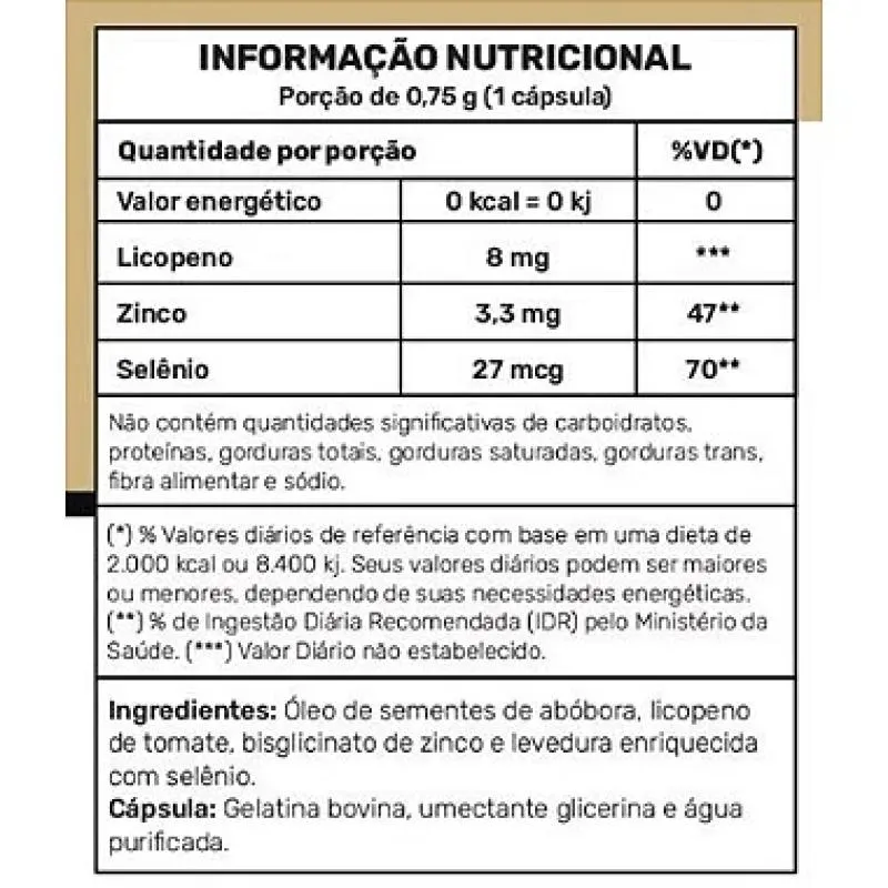 Óleo de semente de abobora, licopeno de tomate, bisglicinato de zinco e levedura enriquecida com selênio. Cápsula: gelatina bovina, umectante glicerina e água.