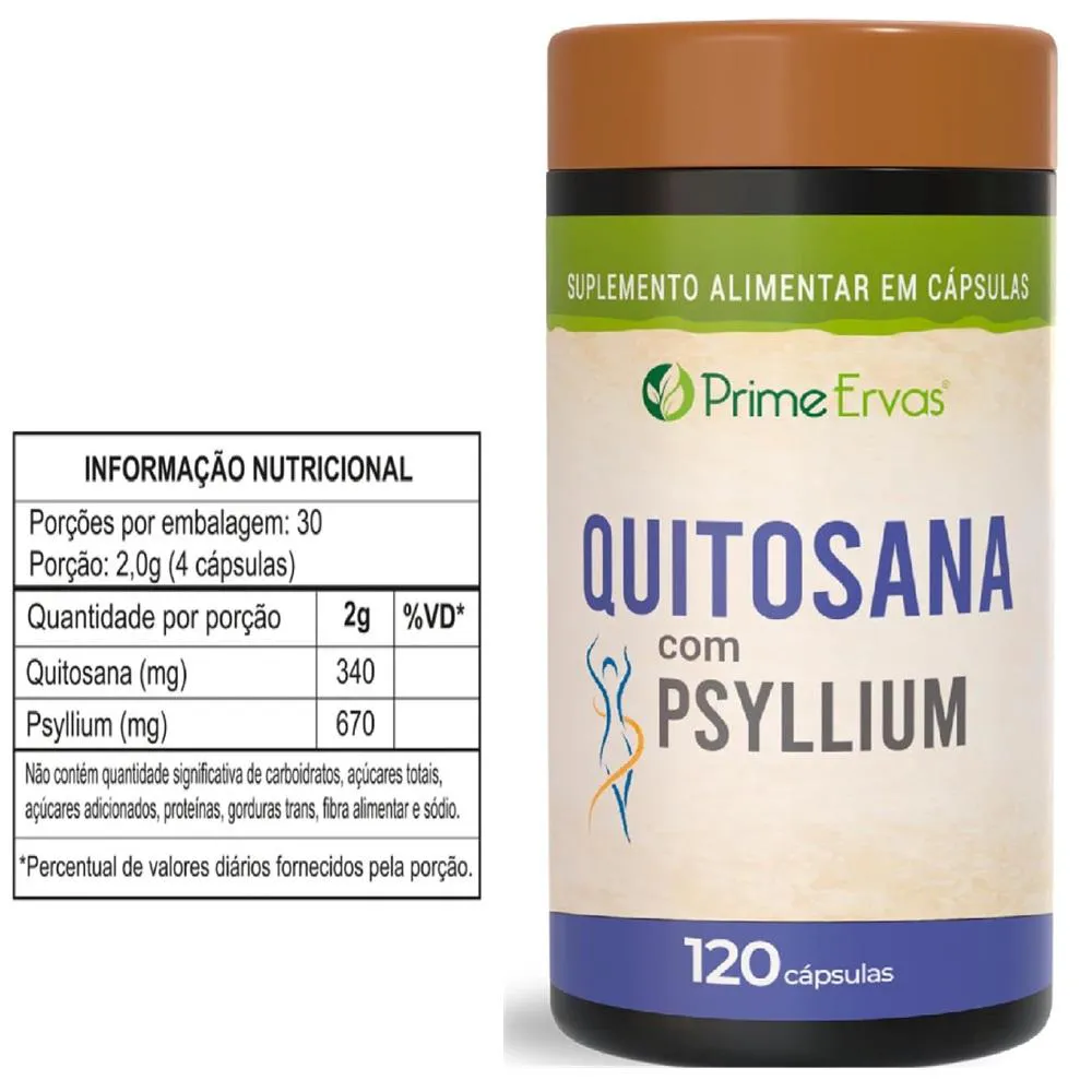Quitosana com Psyllium 120 Cápsulas de 500mg Prime Ervas Composição: Psyllium Husk (Plantago Ovatae) e Quitosana em pó (Fibra de Crustáceo). Cápsula: Gelatina e água deionizada. NÃO CONTÉM GLÚTEN. ALÉRGICOS: CONTÉM DERIVADOS DE CRUSTÁCEOS (CARANGUEJO). Sugestão de uso: Ingerir 2 cápsulas 30 minutos antes do almoço e jantar (consumir junto com alimentos para facilitar sua assimilação) ou conforme indicação. Cada frasco rende 30 doses. Conservação: Após aberto, manter a embalagem bem fechada e armazenar em local fresco, seco e ao abrigo de luz. Produto lacrado para sua proteção. Não utilizar em caso de violação. Manter fora do alcance de crianças. Este produto é um suplemento alimentar e a idade mínima recomendada para consumo é 19 anos. Produto isento de registro conforme RDC 240/2018.