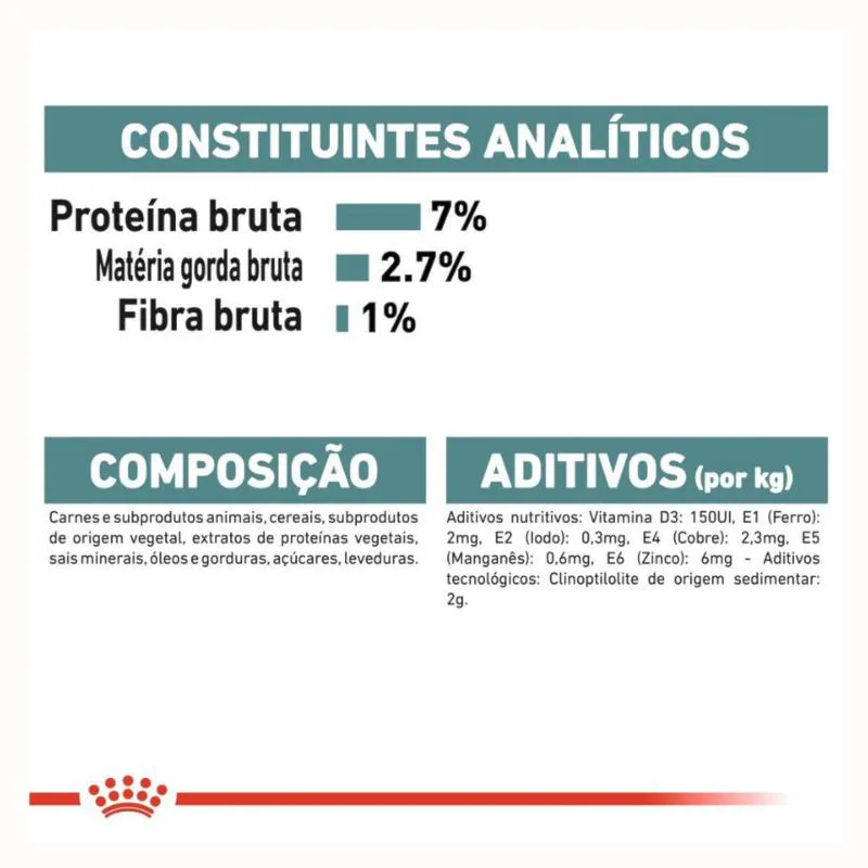 Ração Úmida Sachê Royal Canin Care Hairball Controle de Bola de Pelos Para Gatos Adultos 85gr Pet: Gato; Idade: Adultos; Porte de Raça: Todas as Raças; Condição: Bola de Pelo; Tamanho de grão: Alimento úmido; Controle das bolas de pelo: Formulado especialmente para gatos adultos com tendência à formação de bolas de pelo; Exclusivo complexo Hairball Care: Inclui uma combinação de fibras dietéticas, como psyllium e fibras insolúveis, que estimulam o trânsito intestinal, permitindo a eliminação dos pelos nas fezes; Estudo interno comprovado: Dobra a eliminação de pelos nas fezes após 14 dias de uso, reduzindo a necessidade de regurgitação dos pelos acumulados; Fórmula completa e balanceada: Alto teor proteico (34%) e gorduras (15%) garantem uma nutrição adequada; Alimento super premium: Proporciona uma alimentação rica em nutrientes; Código de barras: 7896181218104. A Ração Úmida Royal Canin Care Hairball em Sachê é formulada especialmente para gatos adultos que possuem uma tendência natural à formação de bolas de pelo. Esse problema comum ocorre devido ao hábito de se lambuzarem com frequência para higienização, o que leva à ingestão de grandes quantidades de pelos. Esses pelos podem se compactar no trato digestivo e formar bolas que são regurgitadas ou eliminadas nas fezes, causando desconforto para o gato. Pensando nisso, a Royal Canin desenvolveu uma fórmula avançada, oferecendo uma solução que facilita a eliminação dos pelos ingeridos e reduz a formação dessas bolas no sistema digestivo do seu felino. Tecnologia Hairball Care Sua composição é rica em nutrientes e pela presença de um exclusivo complexo de fibras. Esse complexo combina fibras dietéticas e psyllium, conhecidos por serem ricos em mucilagem, com fibras insolúveis que atuam diretamente na estimulação do trânsito intestinal. Com essa formulação, os pelos ingeridos são eliminados naturalmente nas fezes, diminuindo significativamente a chance de acumulação no estômago e evitando a regurgitação. Estudos internos da marca demonstram que a quantidade de pelos eliminados pelas fezes dos gatos pode ser duplicada em comparação com fórmulas comuns. Comprometimento com a qualidade e segurança alimentar Nas últimas cinco décadas, a Royal Canin® colocou a qualidade nutricional e a segurança dos produtos no centro de nossas operações em todo o mundo. Essa atenção aos mínimos detalhes nos ajuda a fornecer a nutrição mais precisa e eficaz para animais de estimação. A saúde é a diferença: Desde 1968, estudamos as necessidades únicas de saúde de gatos e cães no mais minucioso dos detalhes. Ao longo desse tempo, aprendemos que a menor variação nutricional pode fazer uma grande diferença na vida e na saúde do seu pet. Alimento adaptado para as necessidades específicas A saúde de cada gato é tão única quanto eles. No entanto, essas necessidades podem variar de acordo com tamanho, raça ou estilo de vida. Descubra como nossas linhas nutricionais podem ajudar todos os animais a desfrutar de uma vida melhor. Nutrição sob medida? Cada receita individual é formulada para fornecer o nível exato de antioxidantes naturais, vitaminas, fibras, prebióticos e minerais essenciais para as necessidades exclusivas de saúde do seu pet. Composição Água, miúdos de aves, vísceras de suínos, farinha de milho, vísceras de frango, fígado suíno, celulose, farelo de glúten de milho, óleo de girassol, cloreto de potássio, fosfato de potássio, casca de psyllium, carbonato de cálcio, sulfato de cálcio, parede celular de levedura (MOS), cloridrato de cisteína monohidratado, goma alfarroba, corante de caramelo, zeolita, tripolifosfato de sódio, vitaminas (D3, E, B1, B2, B6, B12), cloreto de colina, niacina, pantotenato de cálcio, ácido fólico, biotina, sulfato de zinco, sulfato de ferro, sulfato de cobre, iodato de cálcio, sulfato de manganês, cobre aminoácido quelato, manganês aminoácido quelato, zinco aminoácido quelato, taurina, metionina.