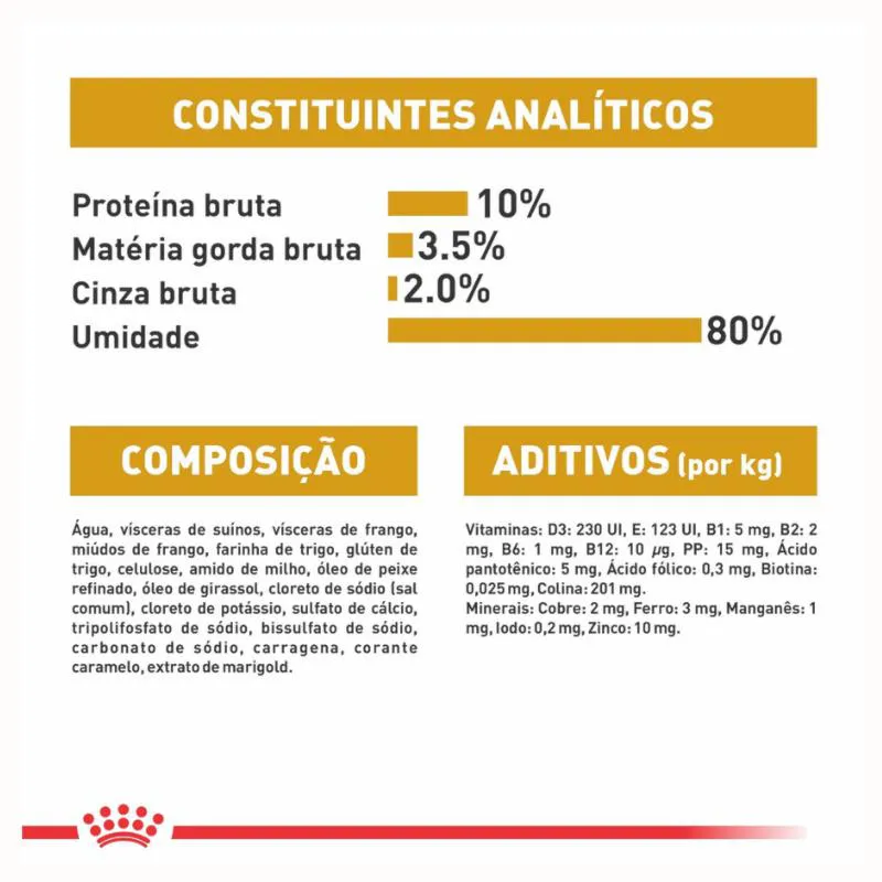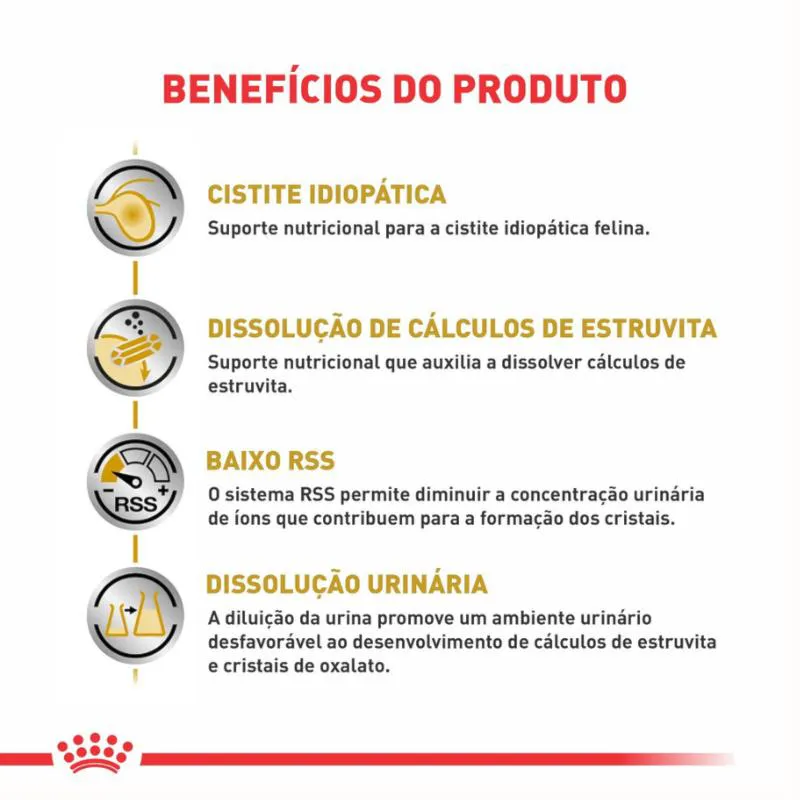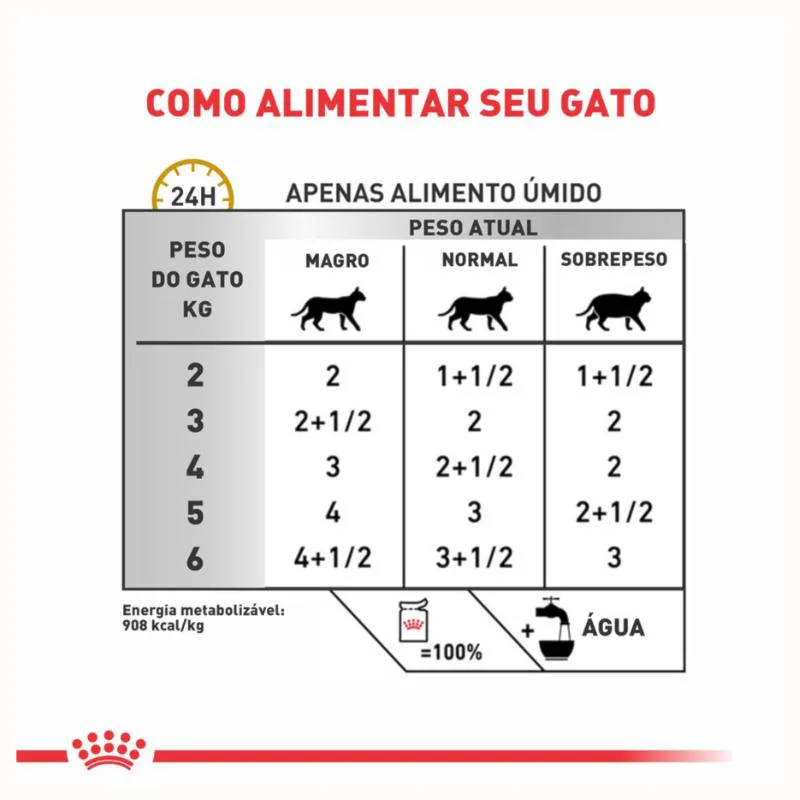 Ração Úmida Sachê Royal Canin Dieta Veterinária Urinária S/O para Gatos Adultos 85gr Pet: Gatos; Idade: Adultos e idosos; Linha: Dieta Veterinária; Tipo de Ração: Super Premium; Porte de Raça: Pequenas, médias e grandes; Tamanho de grão: Pedaços ao molho; Corante: Sem corante; Transgênico: Sem transgênico; Código de barras: 7908248300070. Quais os benefícios da Ração Úmida Sachê Royal Canin Veterinary Diet Urinary S/O? Royal Canin Veterinary Diet Urinary S/O é um alimento coadjuvante úmido indicado para gatos, com o objetivo de oferecer um suporte nutricional na dissolução de cálculos urinários de estruvita e um manejo nutricional para cistite idiopática felina e para urólitos de estruvita e oxalato de cálcio recorrentes usando uma única dieta. A diluição da urina promove um ambiente urinário desfavorável ao desenvolvimento de cálculos de estruvita e cristais de oxalato. Suporte nutricional que auxilia a dissolver cálculos de estruvita. Suporte nutricional para cistite idiopática felina. A saturação urinária adequada cria um ambiente desfavorável à formação de cálculos urinários. A Ração Royal Canin Sachê para Gatos Veterinary Urinary S/O Feline Wet é feita com ingredientes selecionados para a alimentação do seu gatinho. Com nutrição específica auxilia na dissolução de cálculos urinários de estruvita, manejo nutricional para cistite idiopática, urólitos de estrutiva e oxalato de cálcio. Qual o sabor da Ração Úmida Sachê Royal Canin Veterinary Diet Urinary S/O? A ração úmida Royal Canin é um alimento Super Premium que não possui um sabor específico, uma vez que em sua composição possui um mix de carnes adequado a formulação e nutrição específica de cada raça e porte e suas necessidades nutricionais diárias, mas possui uma alta palatabilidade e aroma agradável tanto para gatos quanto para cachorros. Por que a Ração Royal Canin é um alimento Super Premium? Os alimentos Super Premium apresentam um nível nutricional mais elevado, e atendem aos requisitos mínimos estabelecidos pelo Conselho de Nutrição Animal, os níveis nutricionais devem estar em equilíbrio entre os níveis mínimos e máximos apresentados pela AAFCO (Association of American Feed Control Officials). A Ração Úmida Sachê Royal Canin Veterinary Diet Urinary S/O para gatos adultos foi produzida atendendo a todos os requisitos. Esses níveis são determinados pelas pesquisas, que buscam ótimas condições de pelage m, desenvolvimento de musculatura e, principalmente, otimização de desempenho na reprodução e no sistema imunológico.