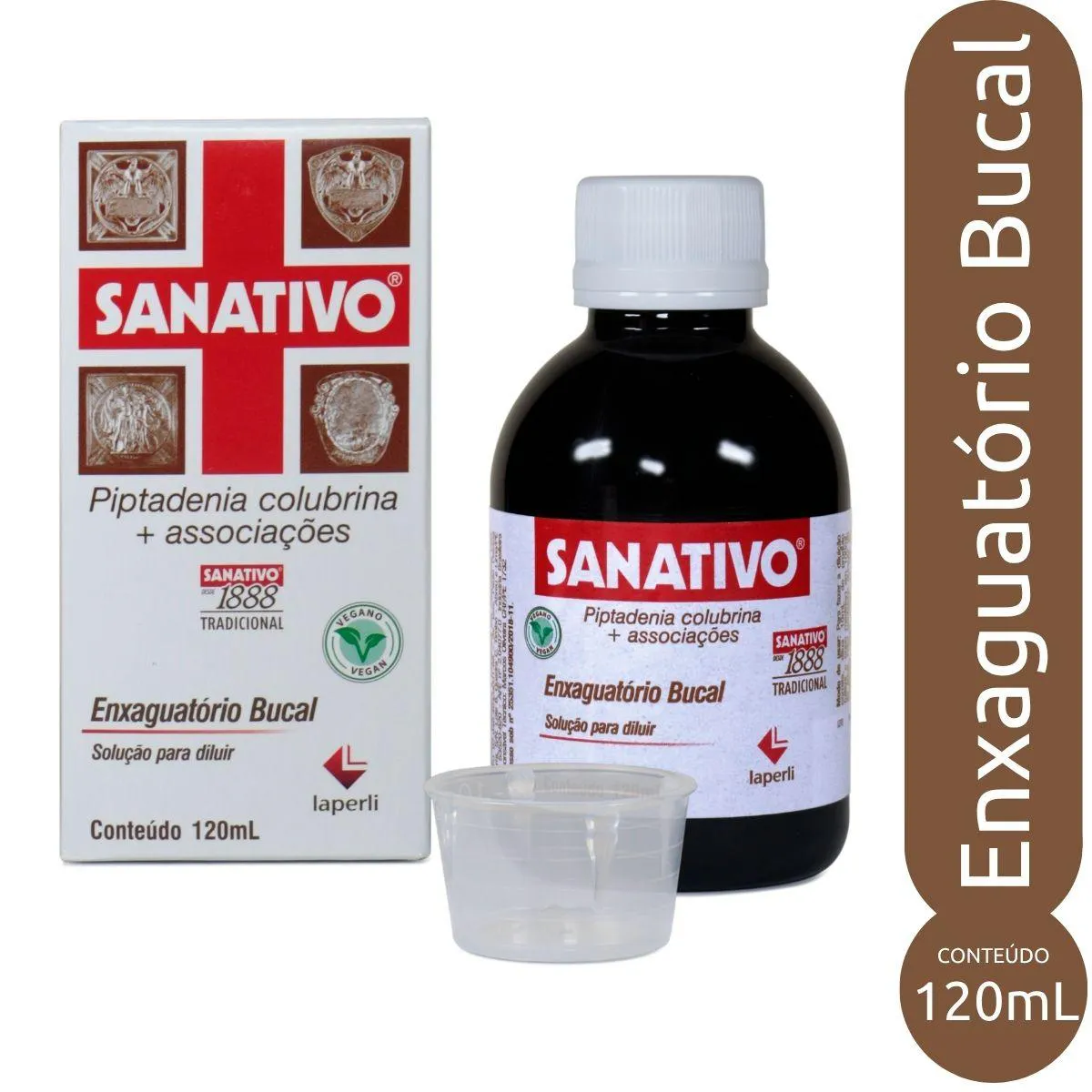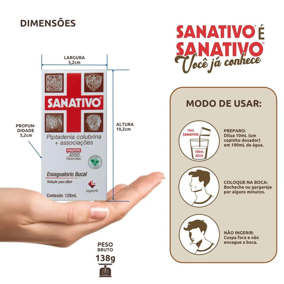 Modo de Usar Simples: Dilua 10 mL de Sanativo® Enxaguatório Bucal no copo medida em um copo de água de 100 mL. Realize o enxágue bucal com esta solução, garantindo uma aplicação fácil para uma proteção duradoura e um hálito fresco.