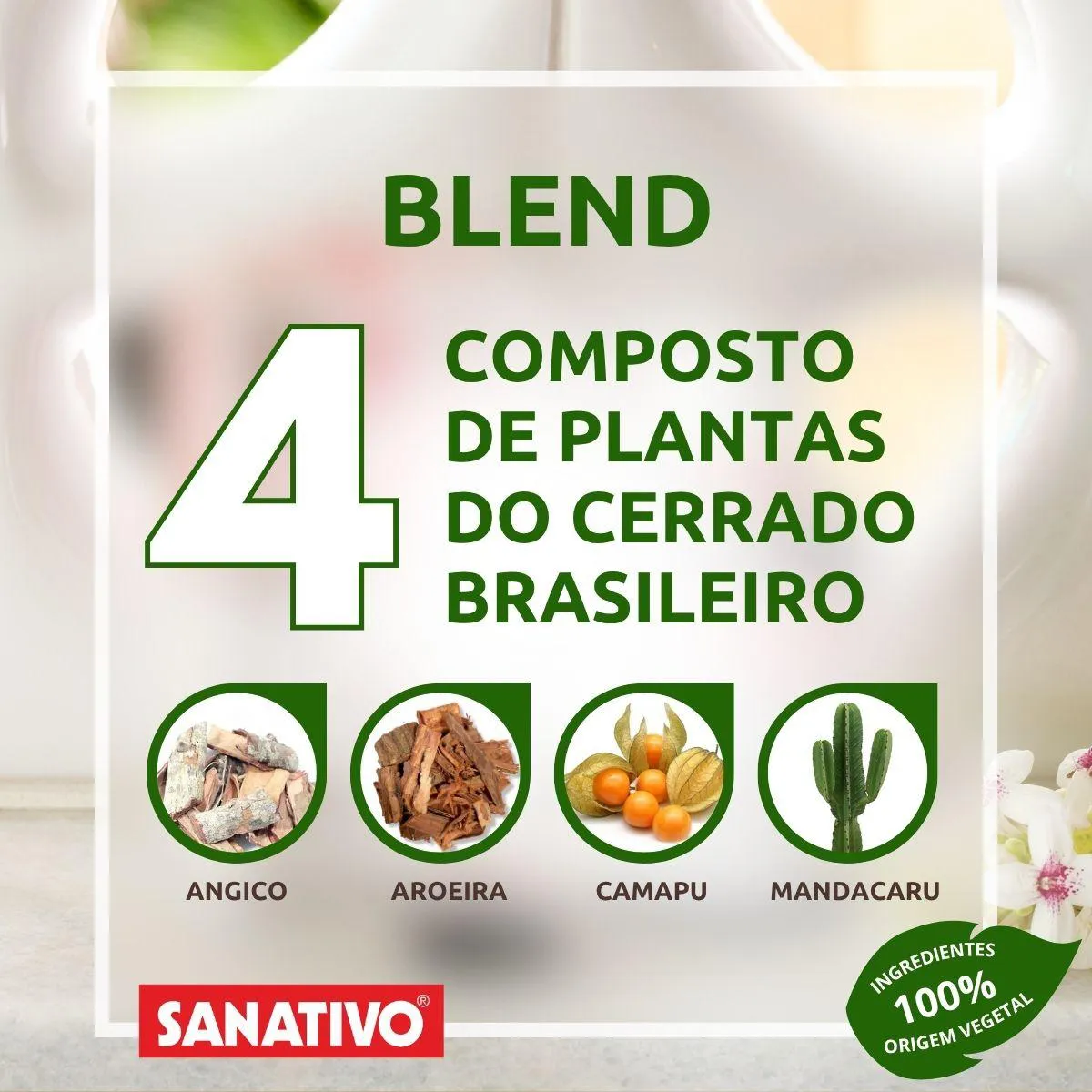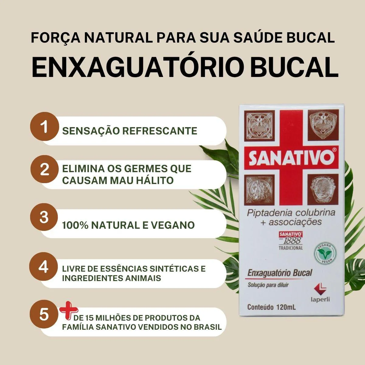 Garanta uma defesa eficaz contra germes com o Sanativo® Enxaguatório Bucal 120 mL, uma poderosa fórmula à base do exclusivo Blend de Aroeira, Angico, Camapu e Mandacaru, plantas nativas do Cerrado brasileiro, especialmente selecionadas por suas propriedades naturais.