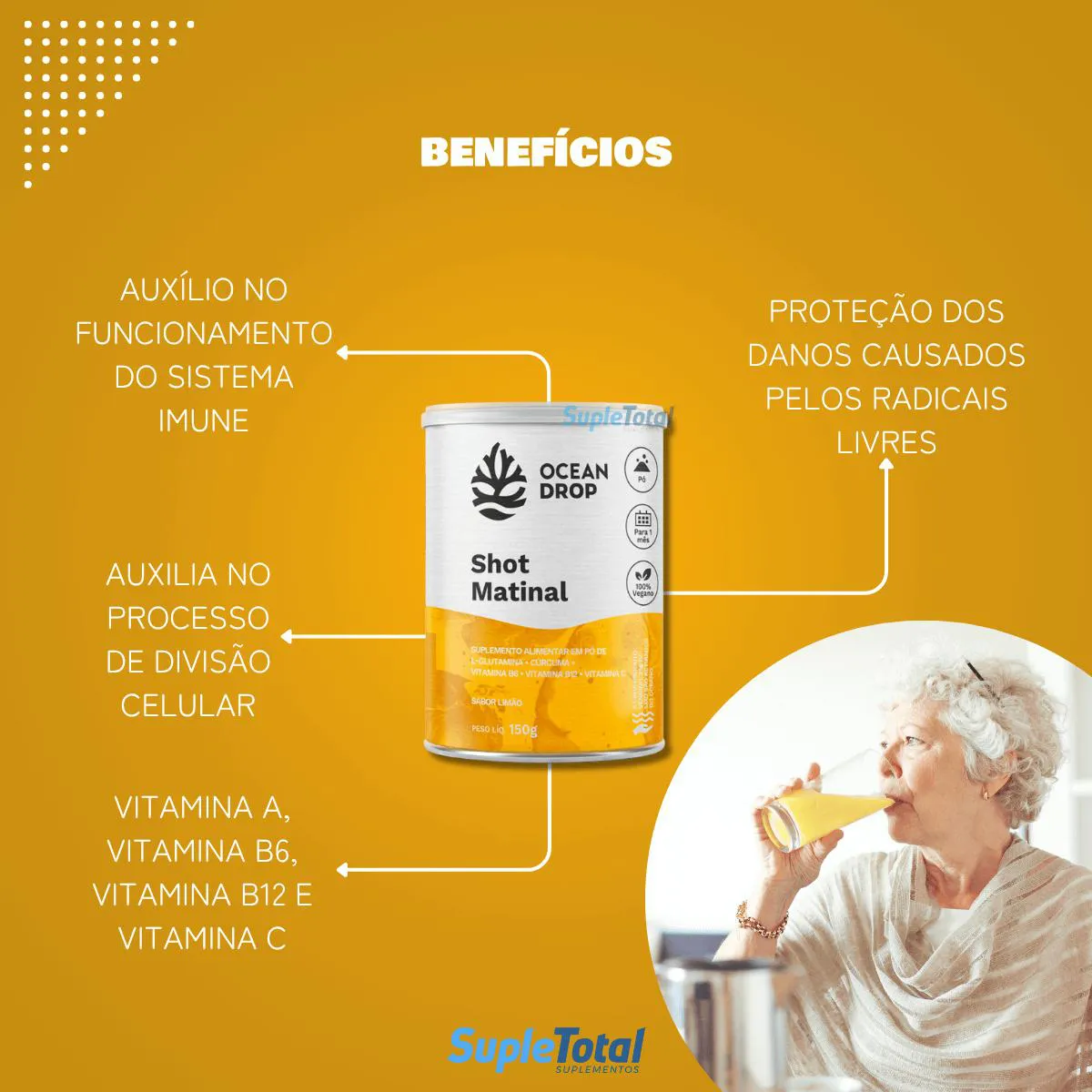 O Shot Matinal da Ocean Drop contém vitamina a, vitamina B6, vitamina B12 e vitamina c que, juntas, oferecem benefícios, como auxiliar no(a):