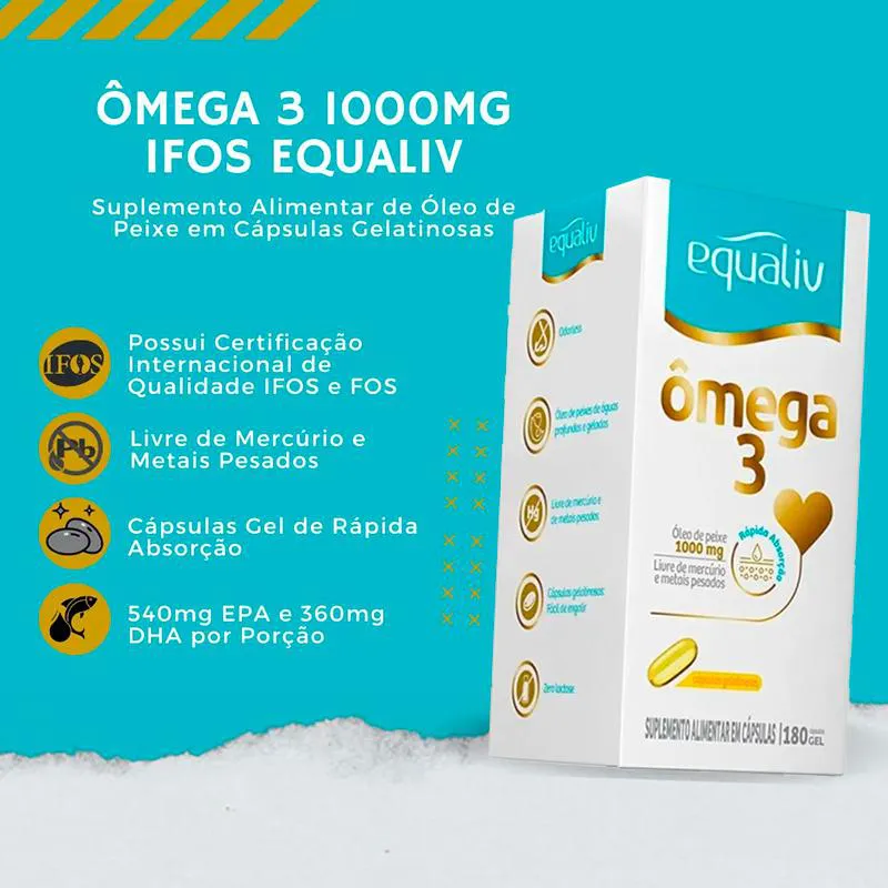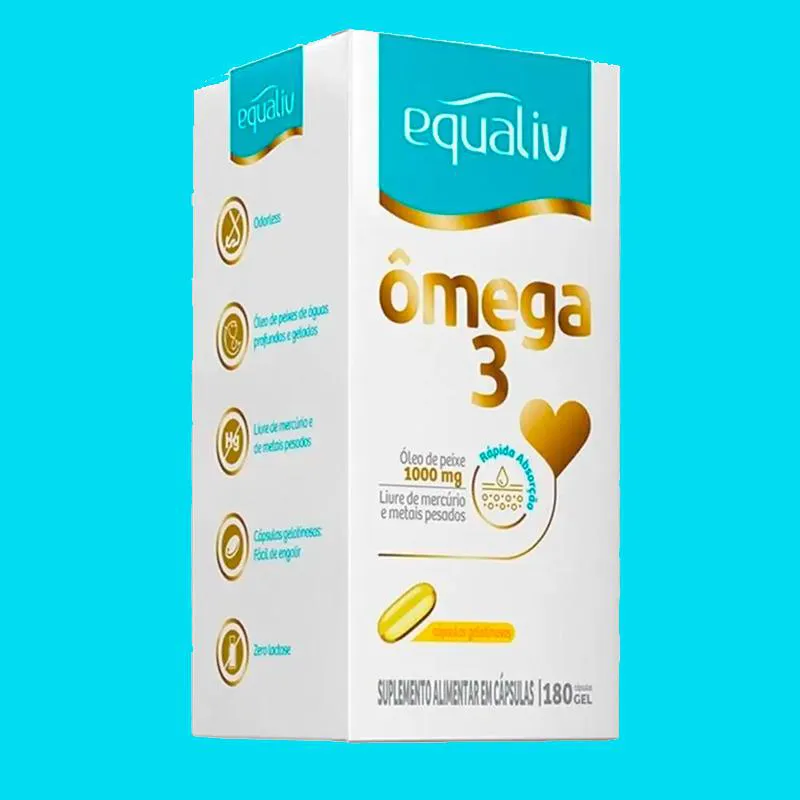 Kit 3 Equaliv Ômega 3 180 cápsulas – Alta Concentração de EPA e DHA O Equaliv Ômega 3 é um suplemento alimentar rico em ácidos graxos essenciais, com 540 mg de EPA e 360 mg de DHA por porção. Auxilia na manutenção da saúde do coração, no equilíbrio dos níveis de triglicerídeos e no bom funcionamento do cérebro e da visão. Sua fórmula é extraída de óleo de peixe purificado, livre de metais pesados. Embalagem com 180 cápsulas gelatinosas. Benefícios: