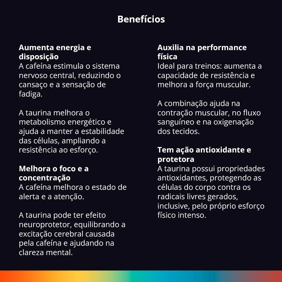 Características técnicas:- Cafeína anidra: atua como antagonista dos receptores de adenosina, prolongando o estado de vigília e reduzindo a percepção de fadiga