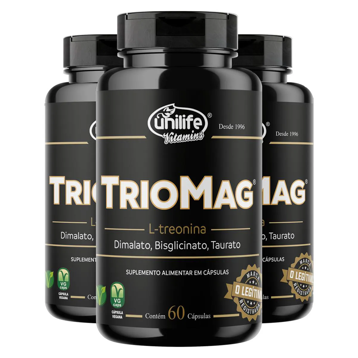 O Kit 3 Triomag Unilife 60 Cápsulas é um suplemento alimentar composto por quatro tipos diferentes de magnésio (Óxido de Magnésio, Dimagnésio Malato, Magnésio Bisglicinato e Taurato de Magnésio) e L-treonina, desenvolvido para oferecer uma fórmula inovadora de suporte nutricional. Cada tipo de magnésio presente no suplemento possui características específicas que contribuem para diferentes funções no organismo.