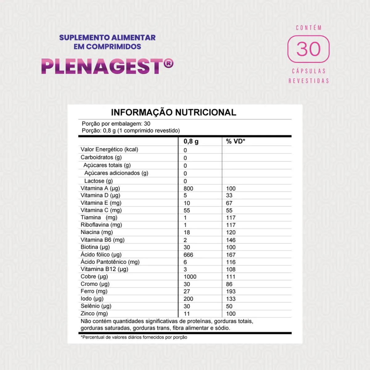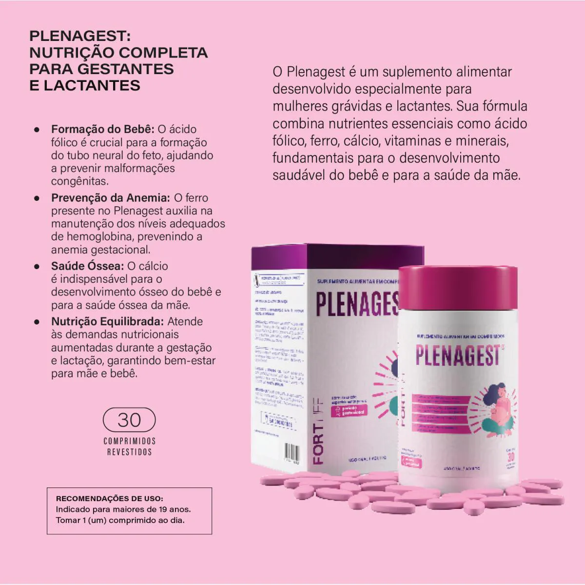 Nutrição completa para Gestantes e Lactantes. O Plenagest é um suplemento alimentar desenvolvido especialmente para mulheres grávidas e lactantes. Sua fórmula combina nutrientes essenciais como ácido fólico, ferro, cálcio, vitaminas e minerais, fundamentais para o desenvolvimento saudável do bebê e para a saúde da mãe. Formação do Bebê: O ácido fólico é crucial para a formação do tubo neural do feto, ajudando a prevenir malformações congênitas. Prevenção da Anemia: O ferro presente no Plenagest auxilia na manutenção dos níveis adequados de hemoglobina, prevenindo a anemia gestacional. Saúde Óssea: O cálcio é indispensável para o desenvolvimento ósseo do bebê e para a saúde óssea da mãe. Nutrição Equilibrada: Atende às demandas nutricionais aumentadas durante a gestação e lactação, garantindo bem-estar para mãe e bebê. RECOMENDAÇÕES DE USO (≥ 19 ANOS):