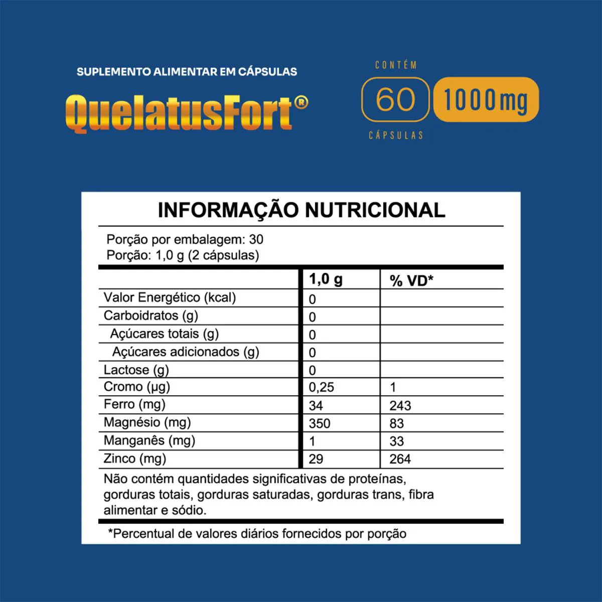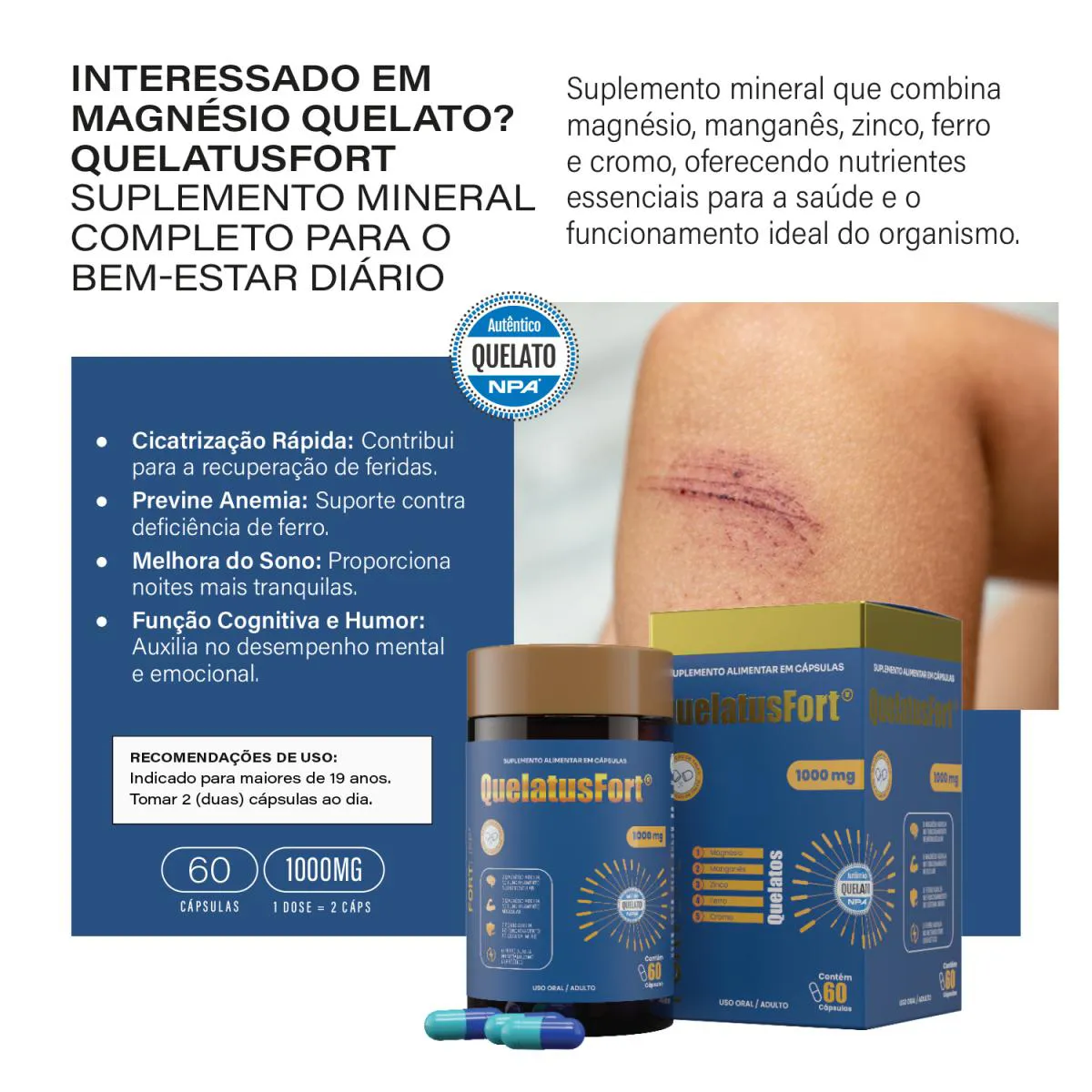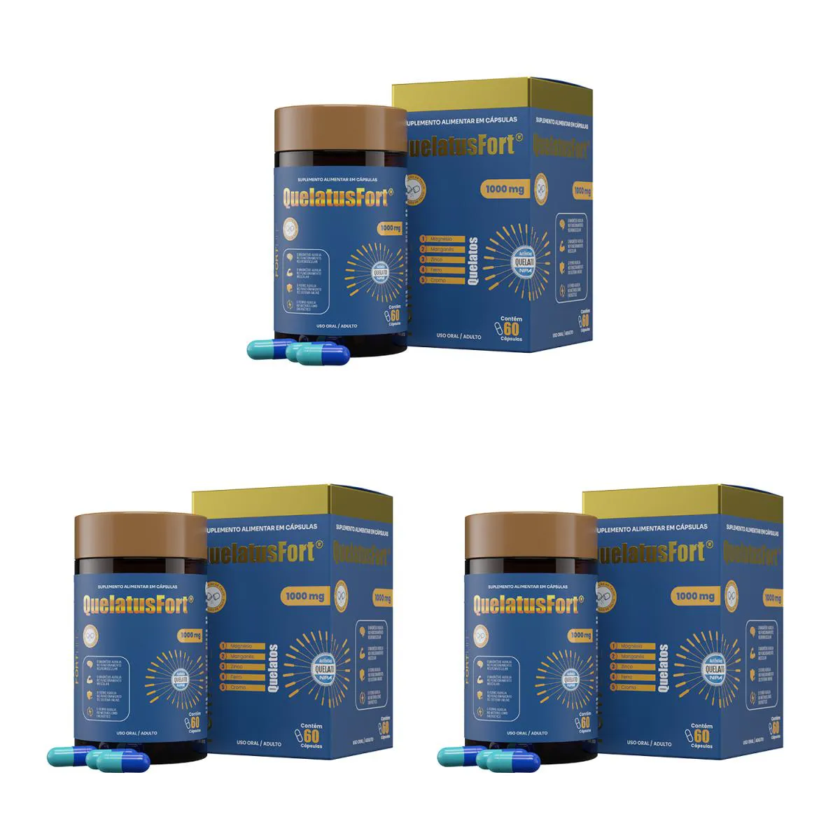 Kit 3 Und QuelatusFort (Magnésio Quelato) 1000mt 60 Cápsulas Suplemento Mineral Completo para o Bem-Estar Diário Suplemento mineral que combina magnésio, manganês, zinco, ferro e cromo, oferecendo nutrientes essenciais para a saúde e o funcionamento ideal do organismo. Cicatrização Rápida: Contribui para a recuperação de feridas. Previne Anemia: Suporte contra deficiência de ferro. Melhora do Sono: Proporciona noites mais tranquilas. Função Cognitiva e Humor: Auxilia no desempenho mental e emocional.