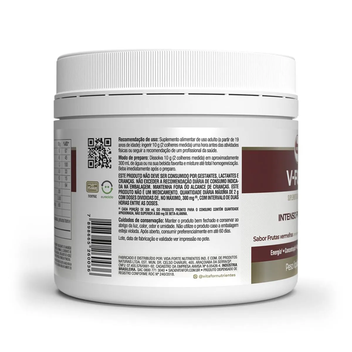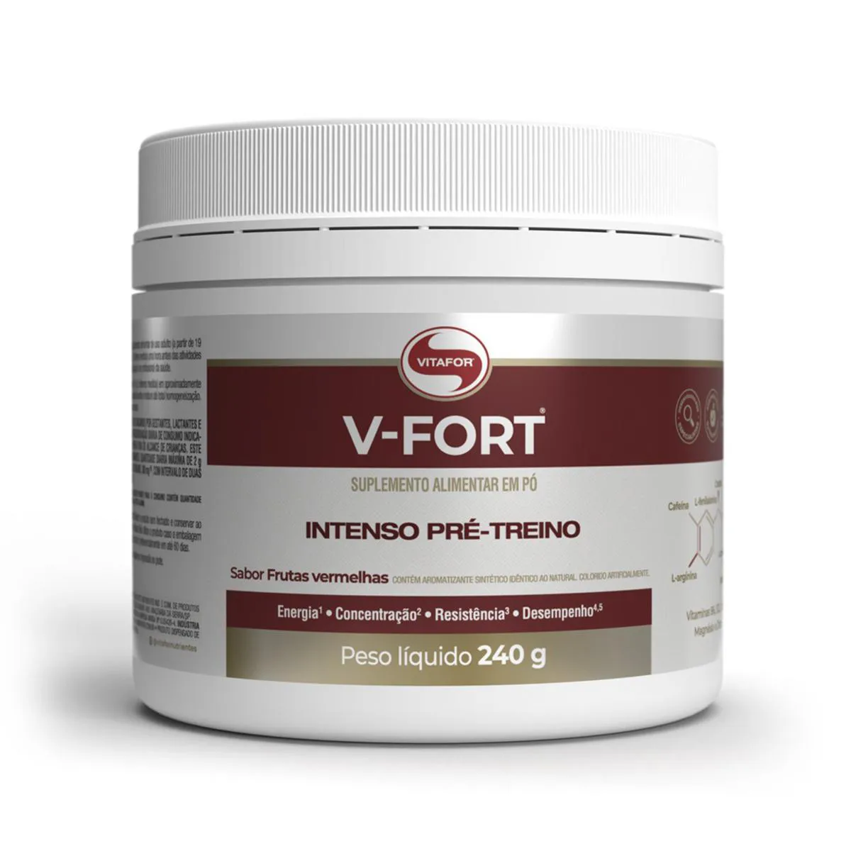 Kit 3 V Fort Pré Treino Vitafor 240g Frutas Vermelhas V-FORT é um suplemento alimentar composto de aminoácidos, vitaminas e minerais. Diferenciais: - Contém: cafeína, creatina e beta-alanina.