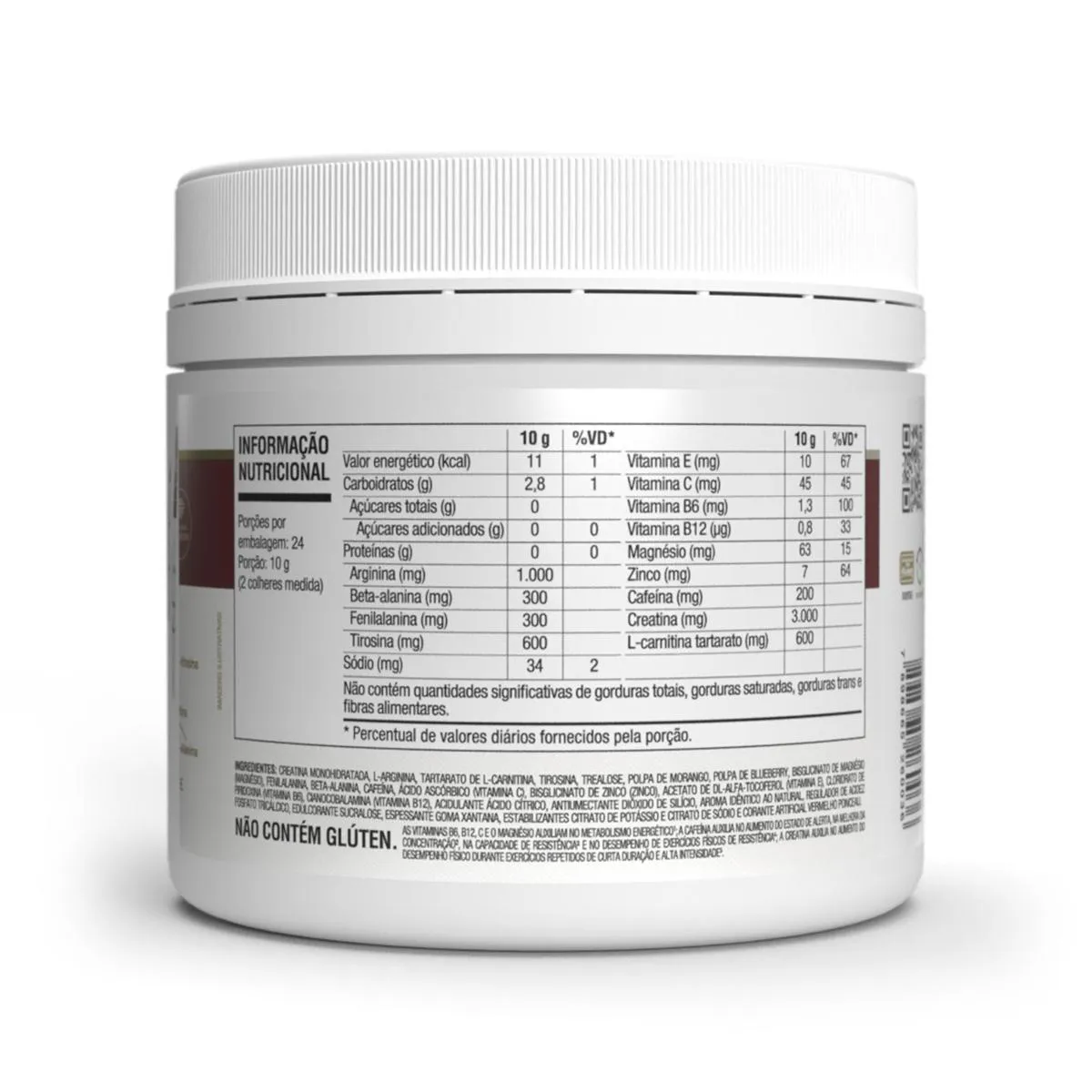 - Selo de Qualidade VLabor. Recomendações de uso: Suplemento alimentar de uso adulto (a partir de 19 anos de idade): ingerir 10 g (2 colheres medida) uma hora antes das atividades físicas ou seguir a recomendação de um profissional da saúde. Modo de uso: Dissolva 10 g (2 colheres medida) em aproximadamente 300 mL de água ou em bebida de sua preferência. Ingredientes - Frutas Vermelhas: Creatina monohidratada, L-arginina, L-carnitina, tirosina, polpa de morango, polpa de blueberry, trealose, fenilalanina, beta-alanina, bisglicinato de magnésio (magnésio), cafeína, ácido ascórbico (vitamina c), bisglicinato de zinco (zinco), acetato de DL-alfa-tocoferol (vitamina e), cloridrato de piridoxina (vitamina B6), cianocobalamina (vitamina B12), acidulante ácido cítrico, antiumectante dióxido de silício, espessante goma xantana, aromatizante idêntico ao natural, regulador de acidez fosfato tricálcico, edulcorante sucralose, estabilizantes citrato de potássio e citrato de sódio e corante artificial vermelho ponceau. NÃO CONTÉM GLÚTEN. Cuidados e conservação: - Manter o produto bem fechado e conservar ao abrigo de luz, calor, odor e umidade.