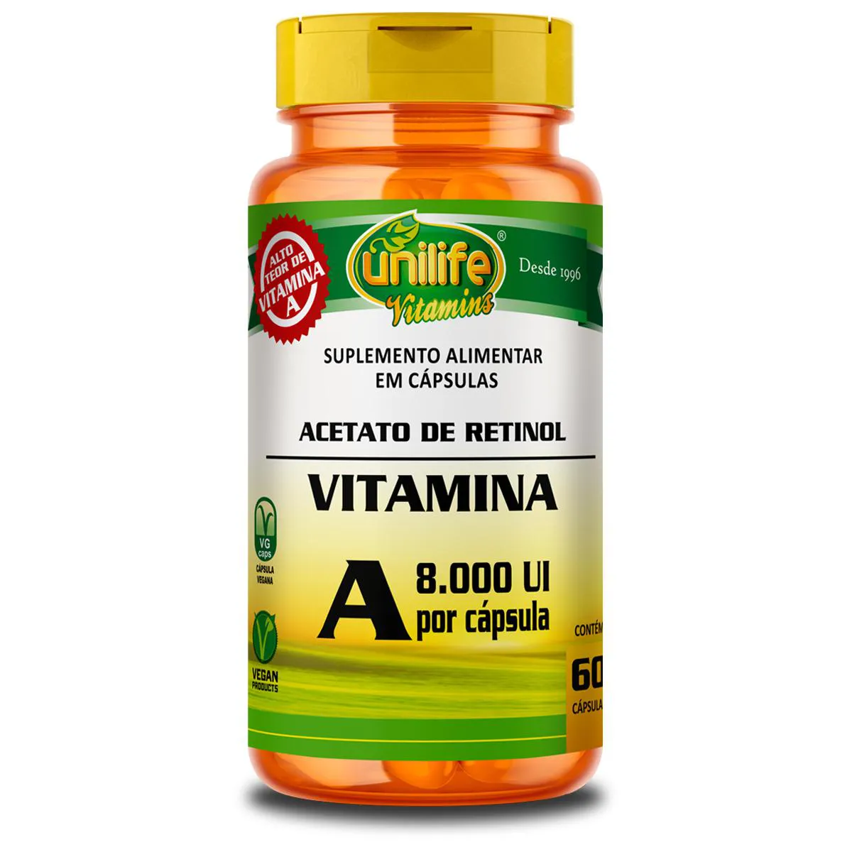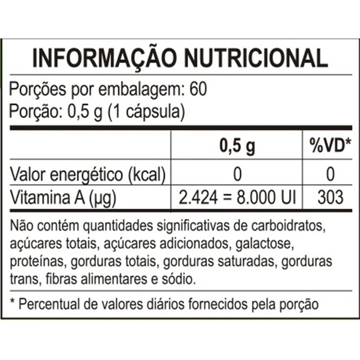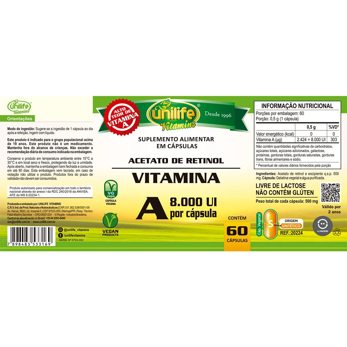 - combate a infeccções nos pulmões, trato urinário, intestino e retina ocular Informações complementares A vitamina a auxilia no combate a infecções, protegendo as membranas das mucosas e mantendo-as úmidas, o que dificulta a entrada de germes e protege o organismo, ainda devido a essa ação nas mucosas ajuda na manutenção da hidratação da pele, sendo comumente adicionada a cosméticos de beleza. é também antioxidante, combatendo radicais livres, que aceleram o envelhecimento. mas é prejudicial em excesso. Ingredientes Vitamina a (retinol), excipiente q.s.p. 500mg, cápsula de gelatina vegetariana e água. não contém glúten. Modo de uso Ingerir de 1 cápsulas ao dia, após a principal refeição. ingerir com líquido.